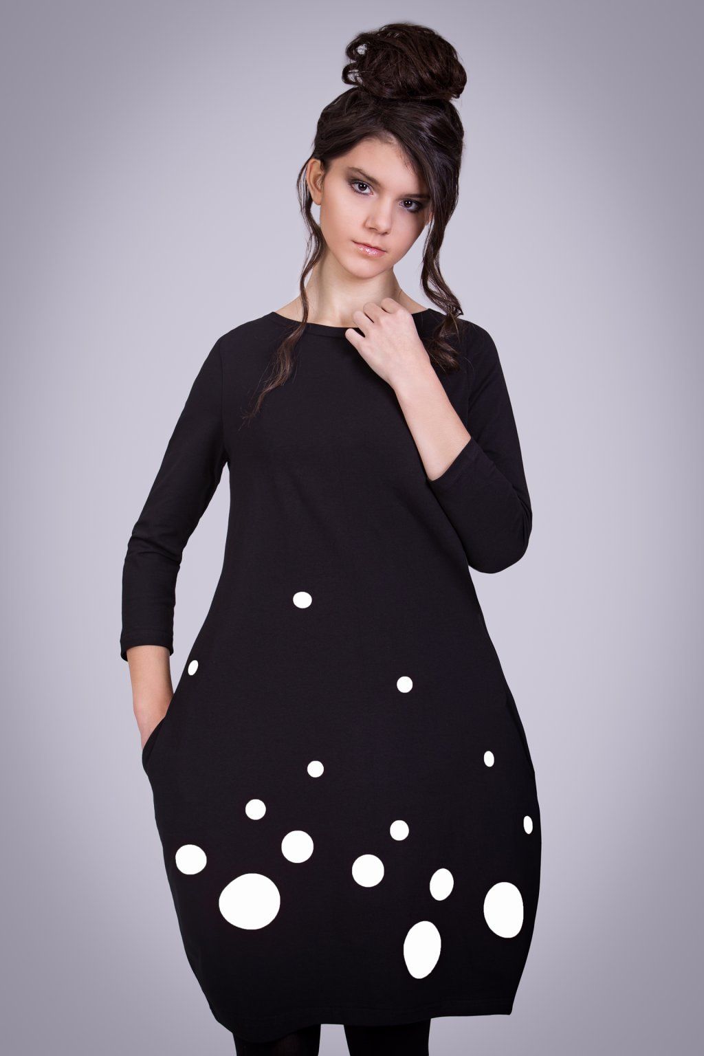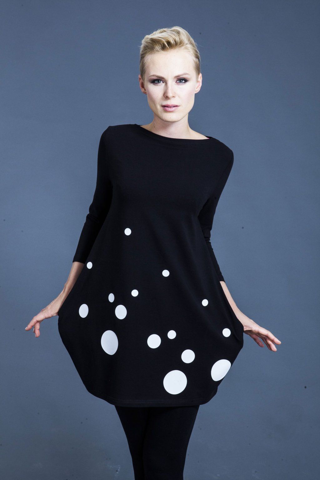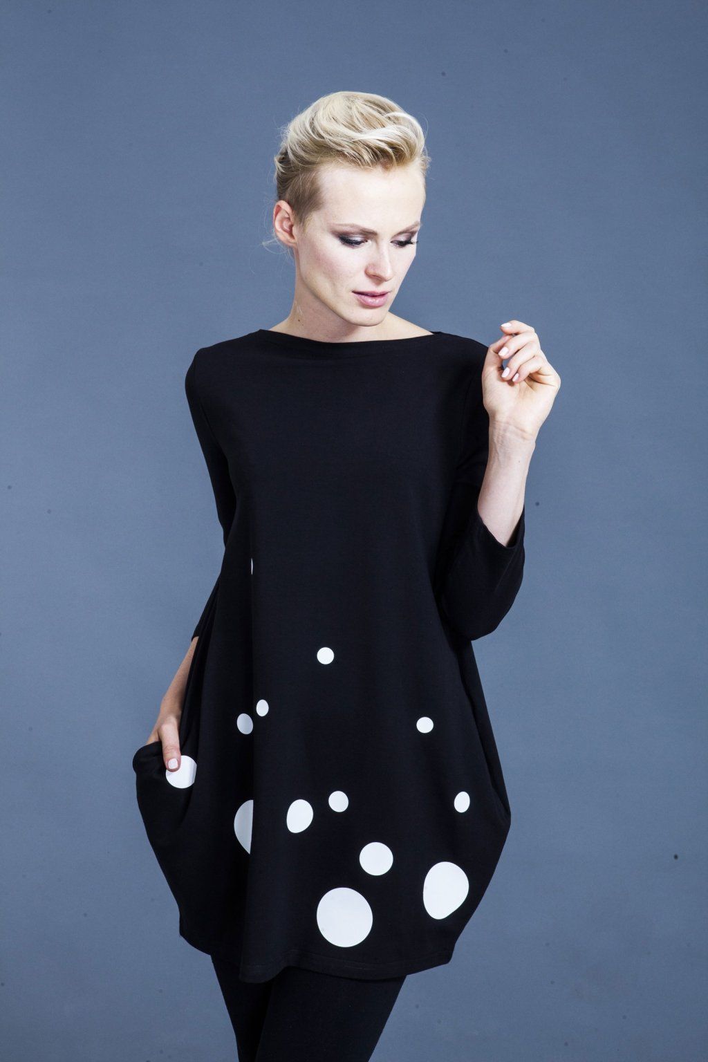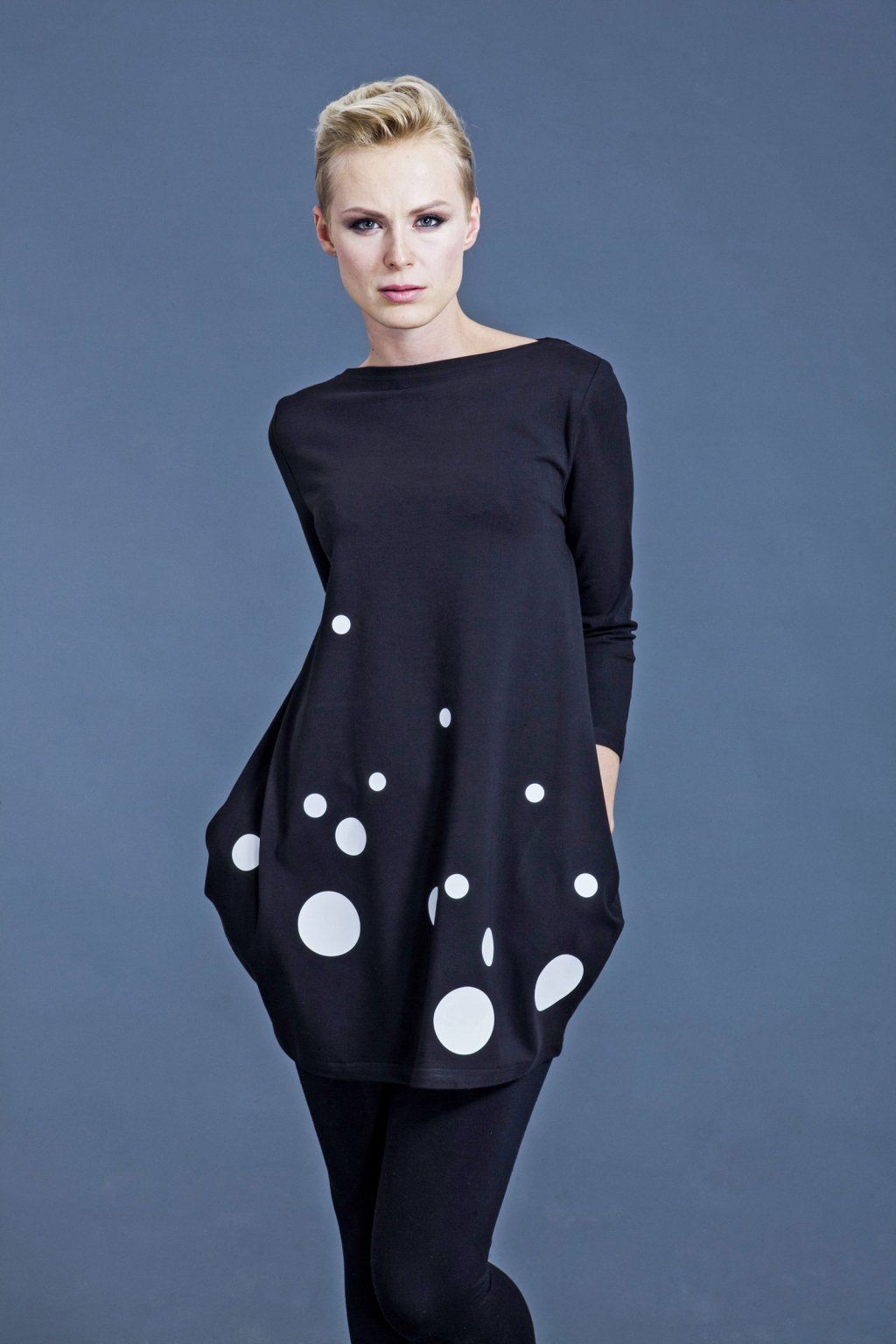Černé úpletové šaty s potiskem bílých bublin různých velikostí. Šaty se směrem dolů rozšiřují pak zaoblují a mírně zužují. Lodičkový výstřih. 3/4 všívaný rukáv. Boční kapsy.