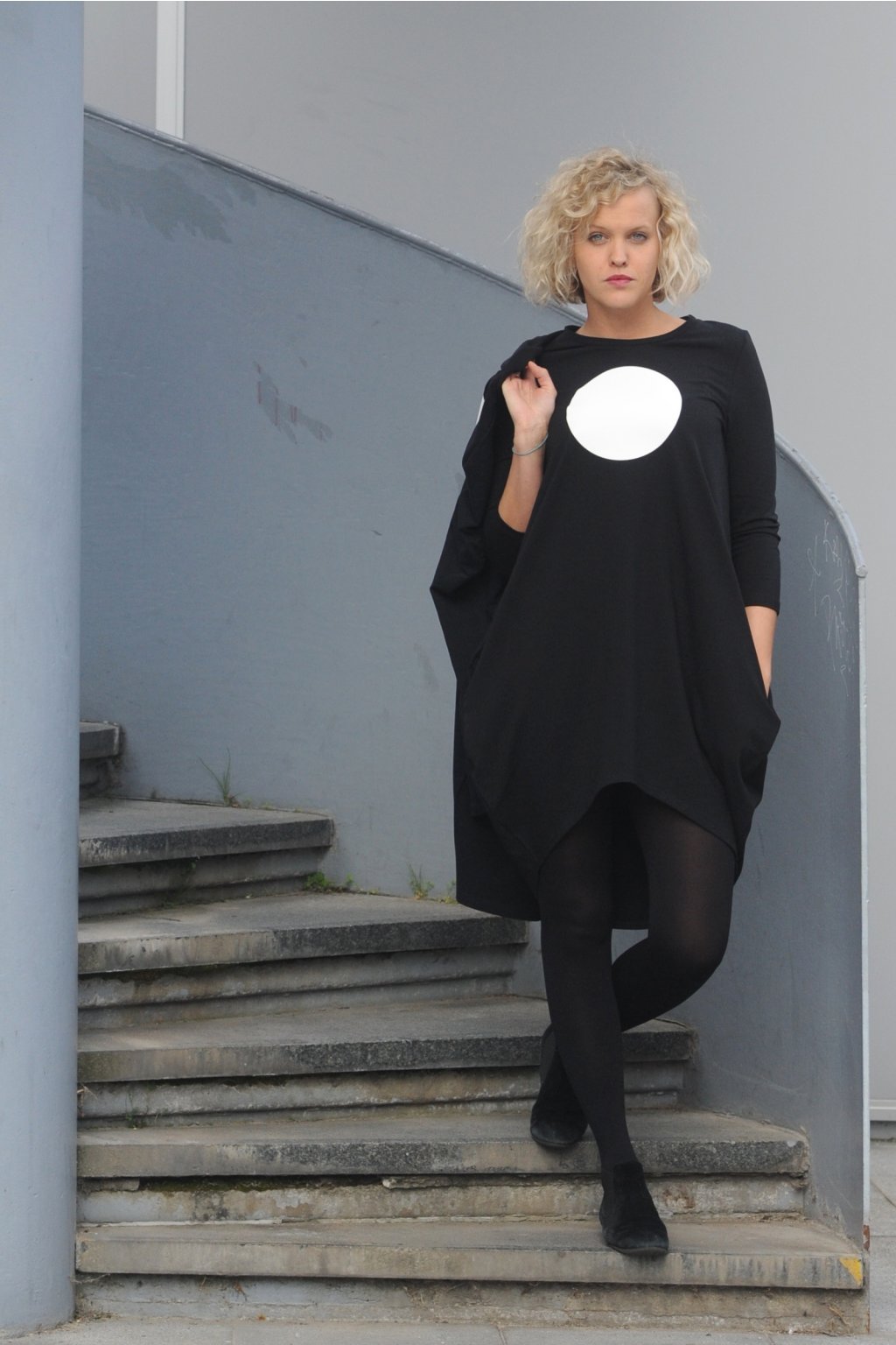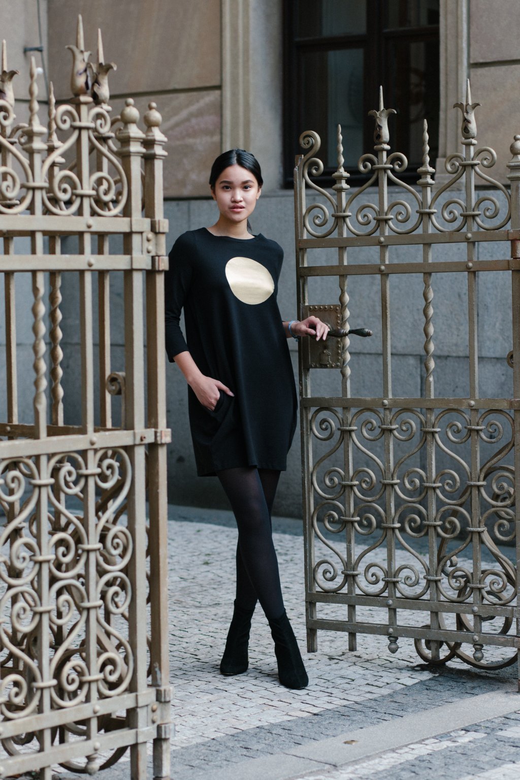 Šaty se směrem dolů rozšiřují, pak zaoblují a mírně zužují. 3/4 všívaný rukáv. Boční kapsy.