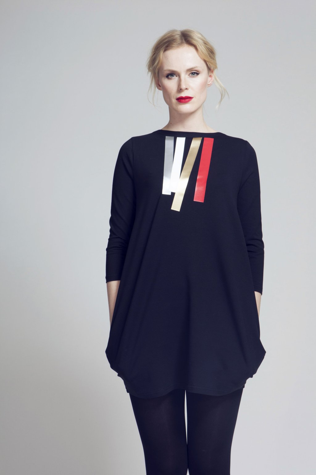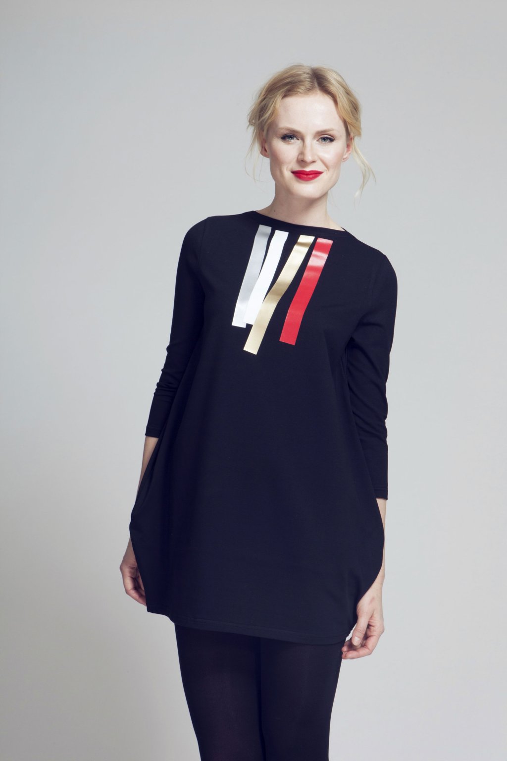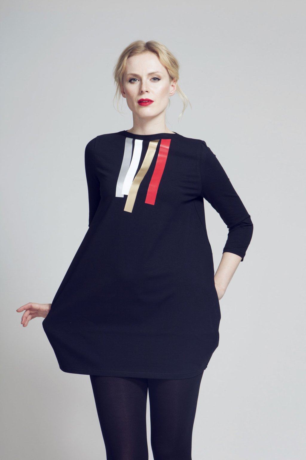 Šaty se směrem dolů rozšiřují, pak zaoblují a mírně zužují. Lodičkový výstřih. 3/4 všívaný rukáv. Boční kapsy.