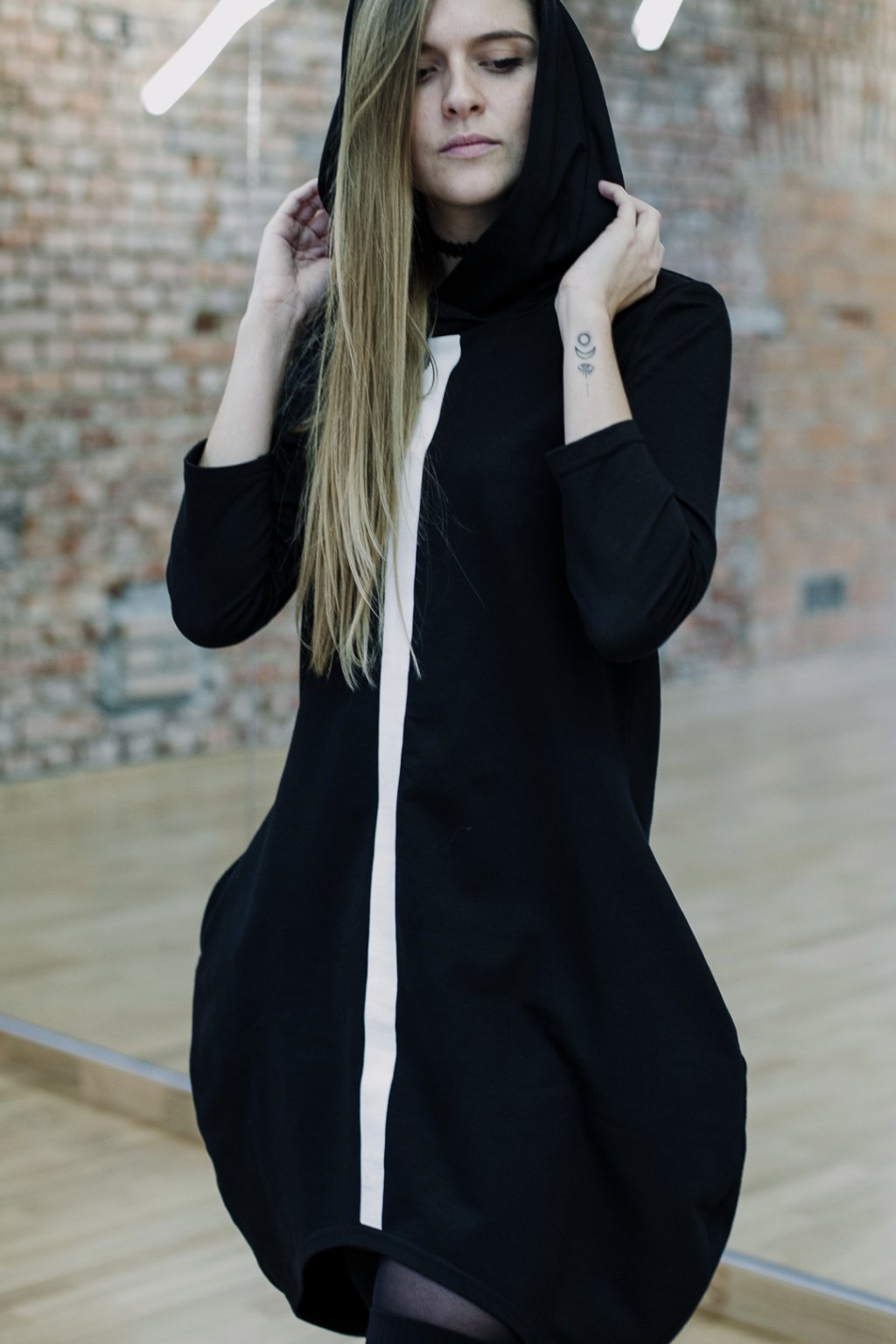 Nepřehlédnutelné, komfortní, černé mikinošaty, v krátké délce, s bočními kapsami, 3/4 rukávem, s kapucí a potiskem bílého pruhu po celé délce