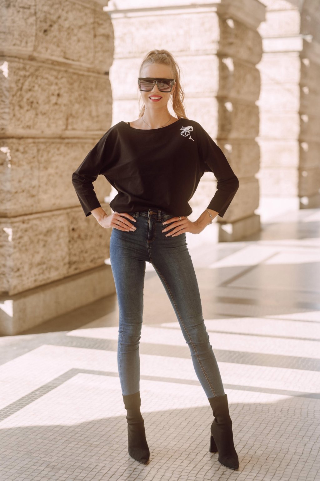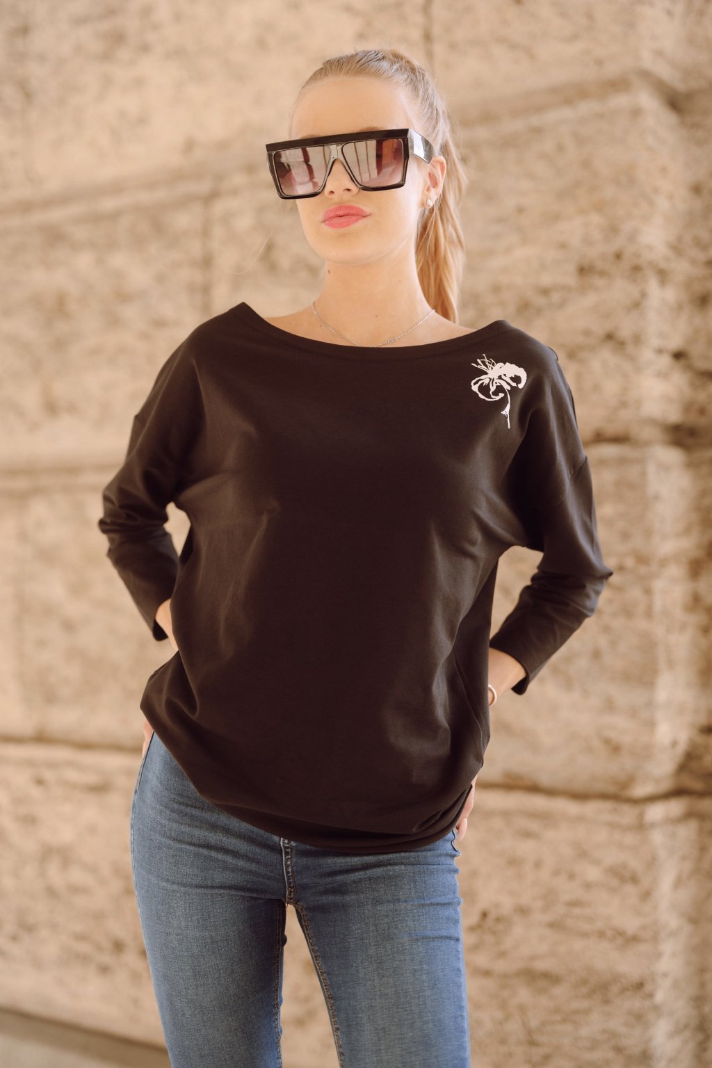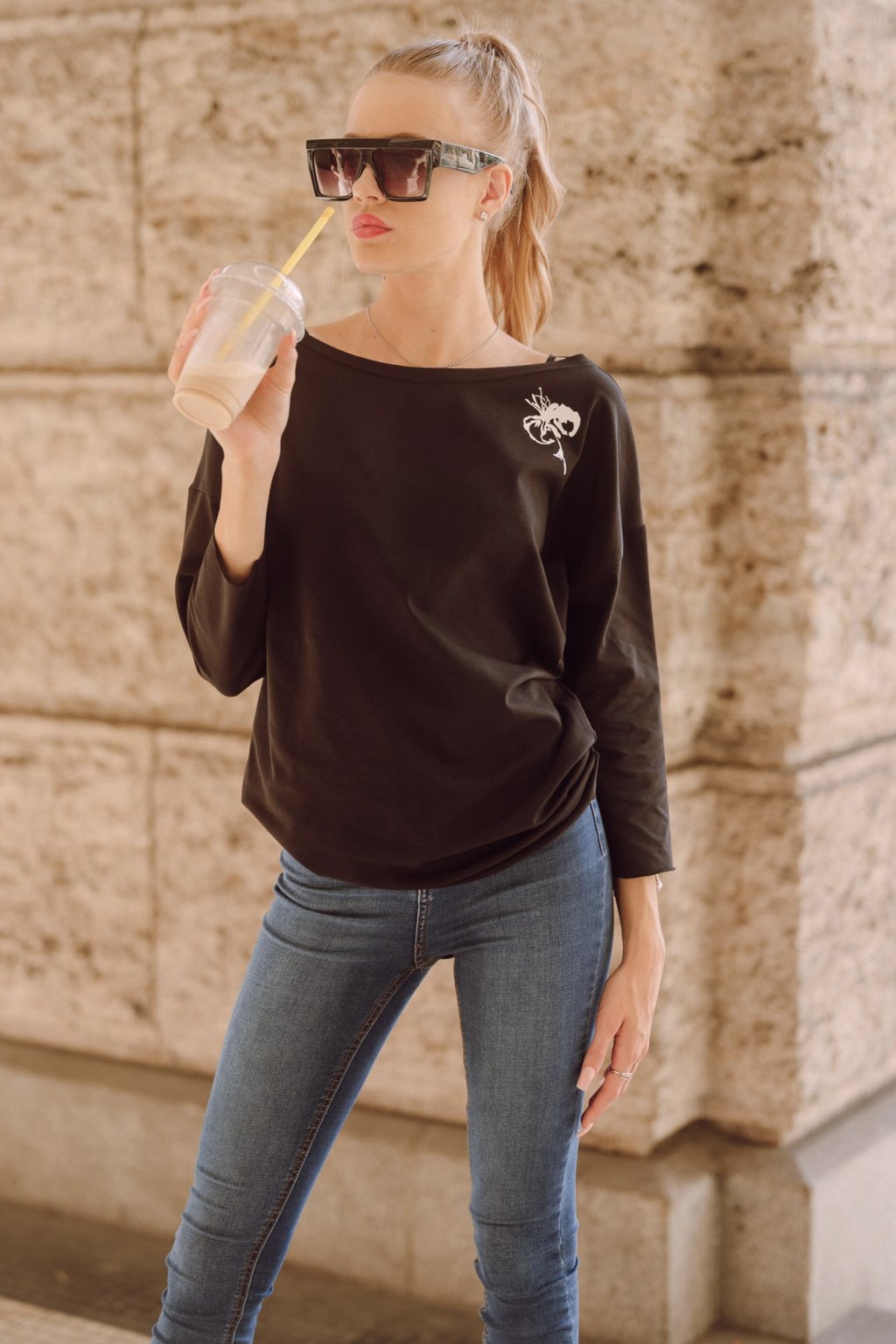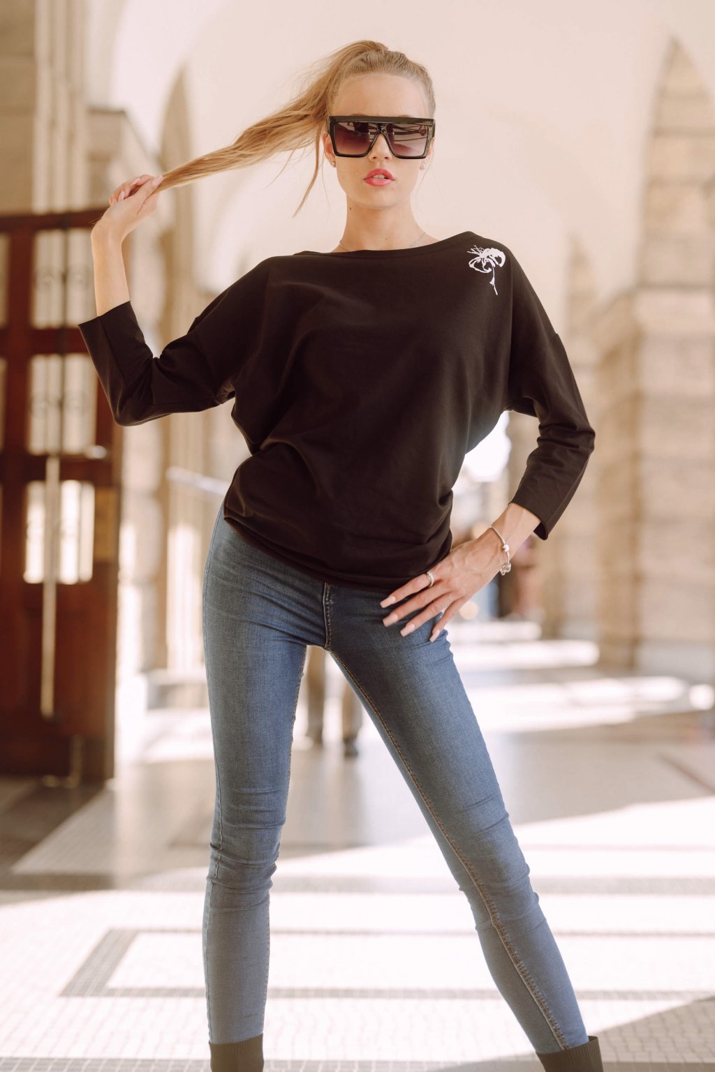 Tričko je netopýřího střihu, v ramenou široké, v bocích zúžené, úzký 3/4 rukáv, okraje nezačištěné. Lodičkový výstřih.