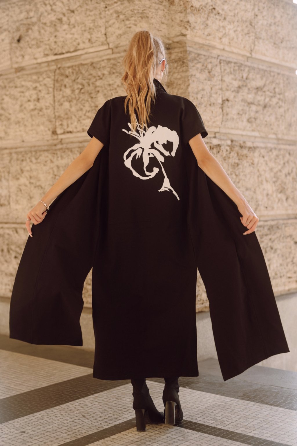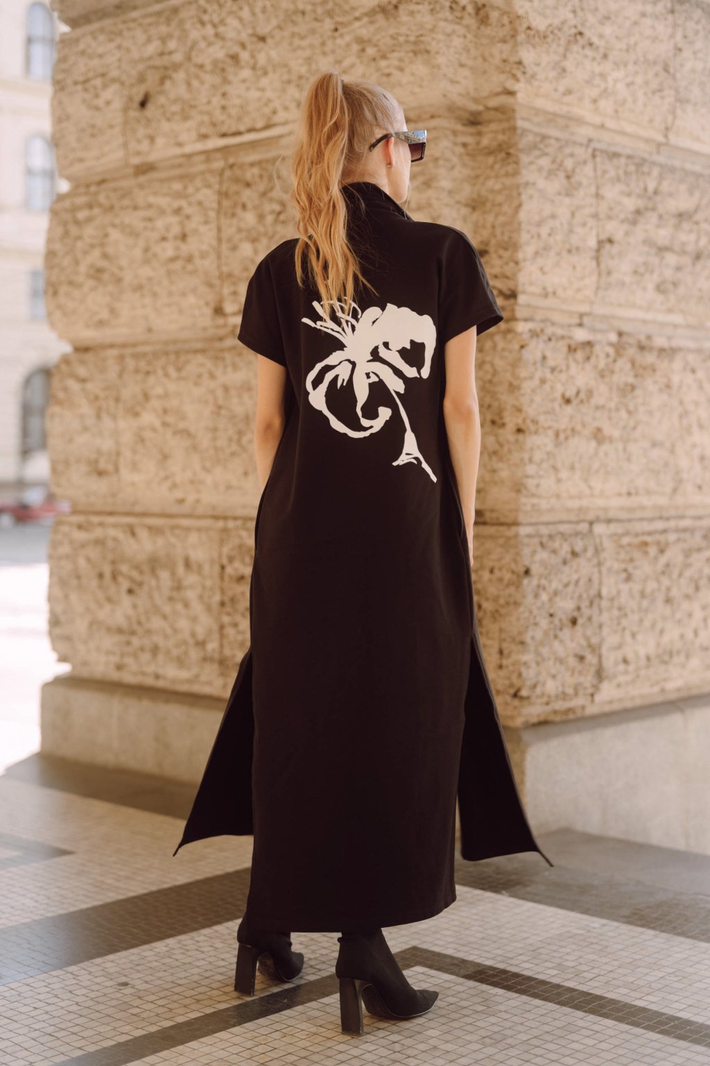Černá dlouhá vesta se šálovým lemem je ušitá z elastické teplákoviny. Je rovného střihu a má kimono krátký rukáv a hodně hluboké rozparky po stranách. Bez kapes.