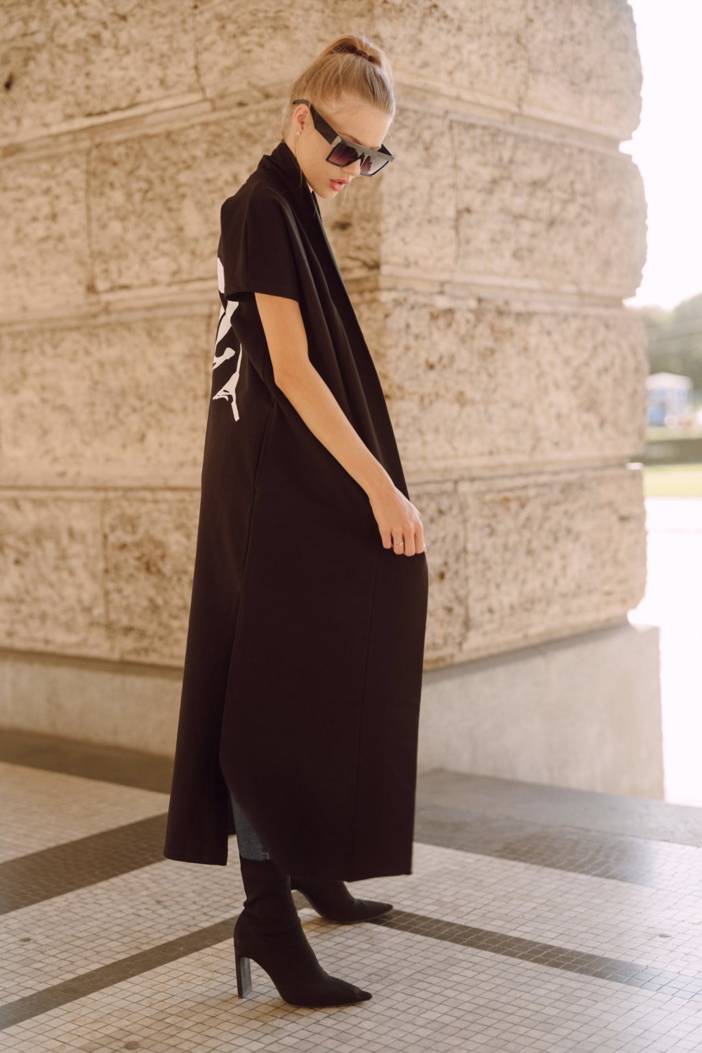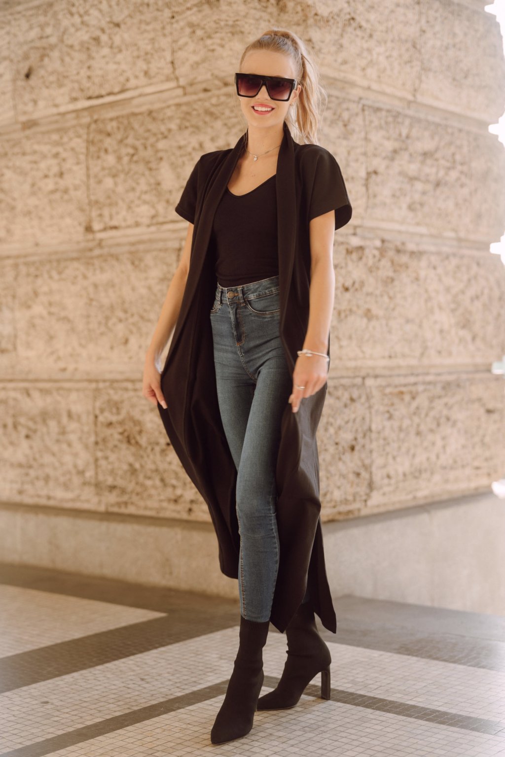 Černá dlouhá vesta se šálovým lemem je ušitá z elastické teplákoviny. Je rovného střihu a má kimono krátký rukáv a hodně hluboké rozparky po stranách. Bez kapes.