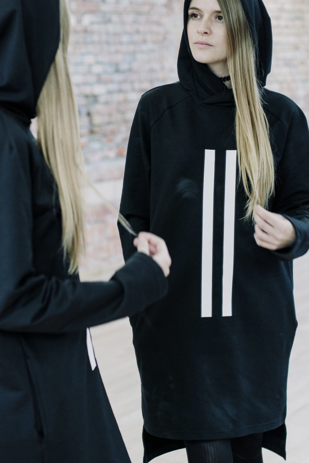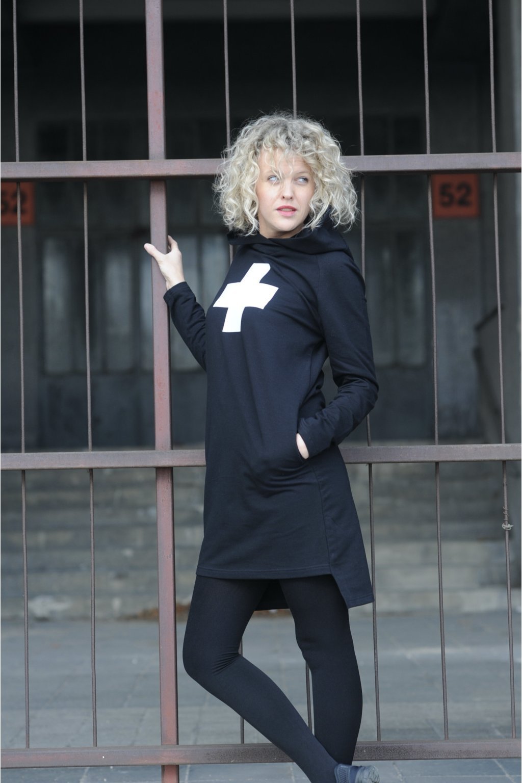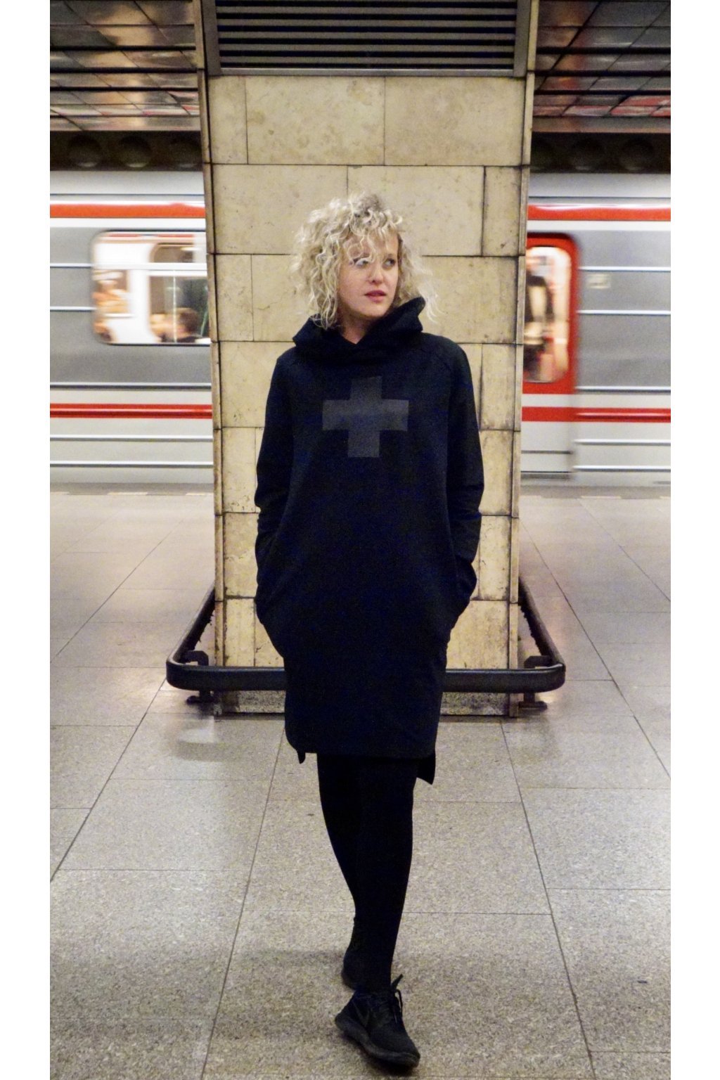 Šaty jsou rovného střihu, zadní díl je prodloužený o 8cm, dlouhý raglánový rukáv a boční kapsy.