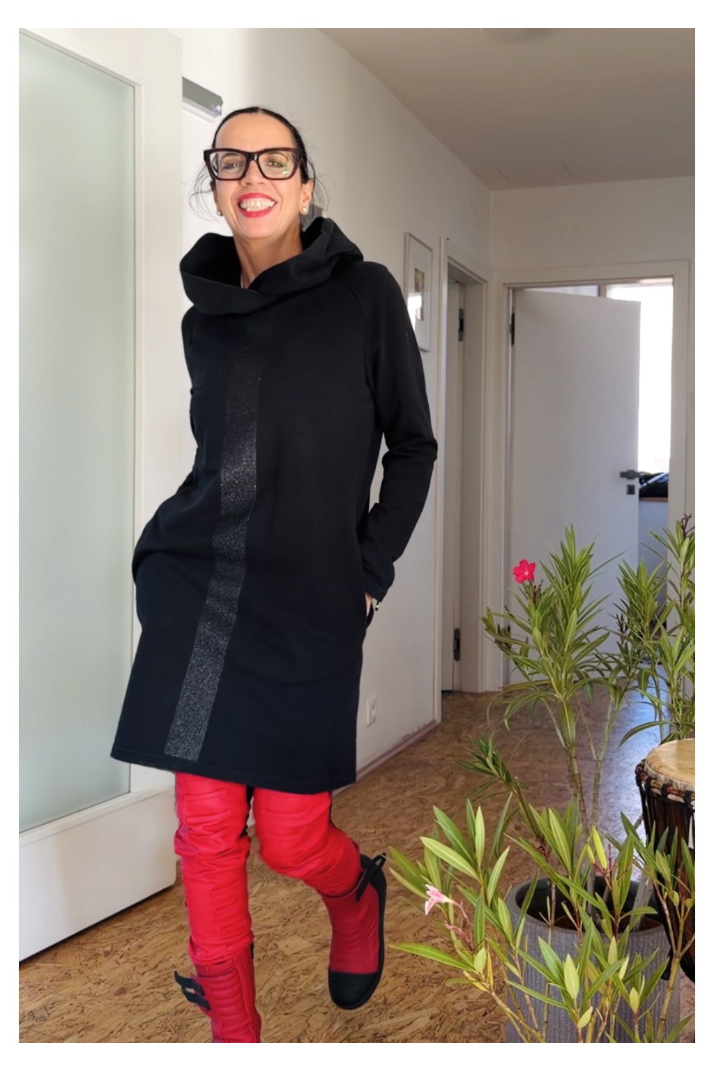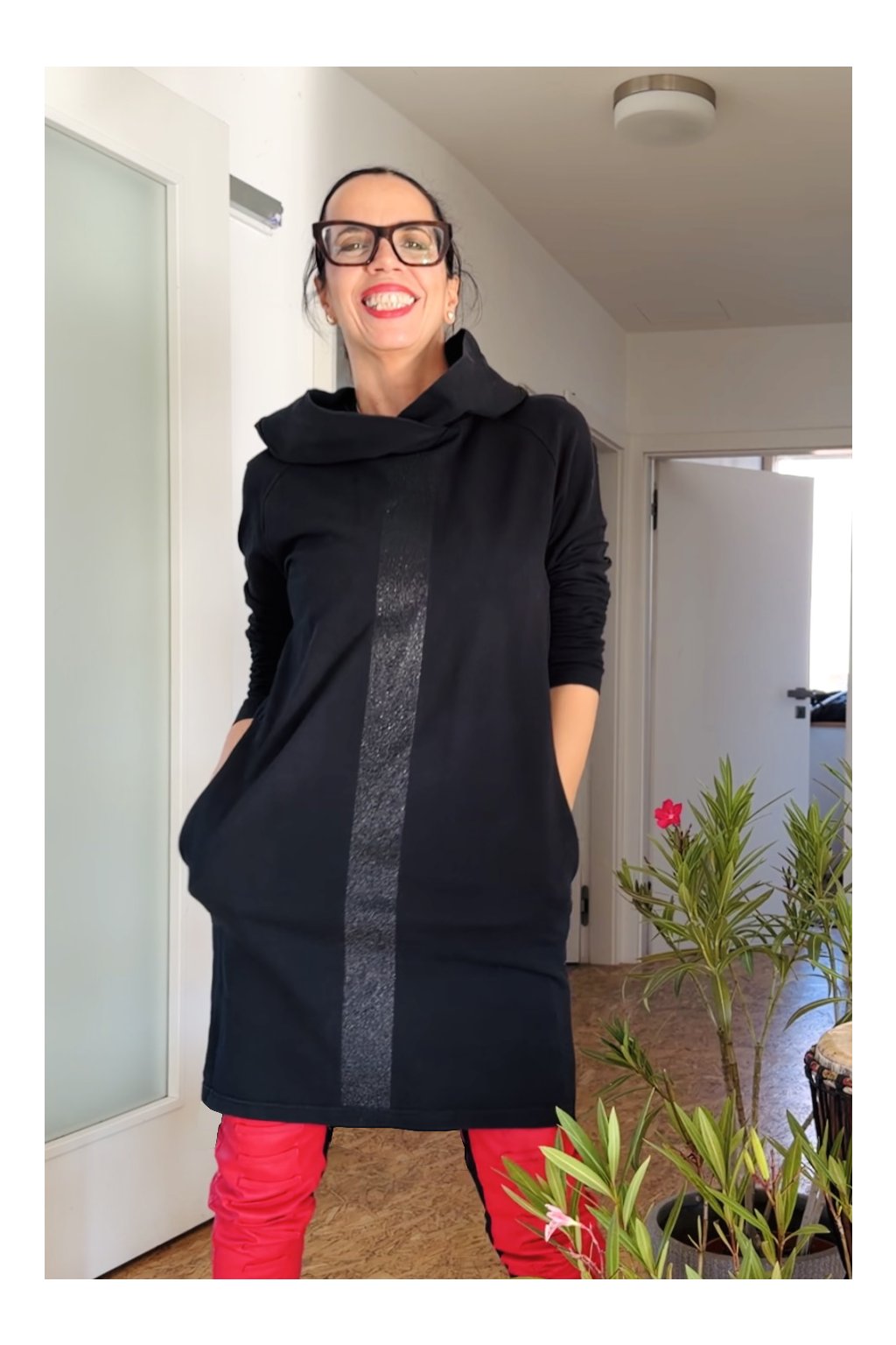 Potisk GLITTER se krásně třpytí, hodí se na slavnostnější chvíle a dodáva šatům punc vyšší elagance. Šaty jsou rovného střihu. Dlouhý raglánový rukáv. Boční kapsy.