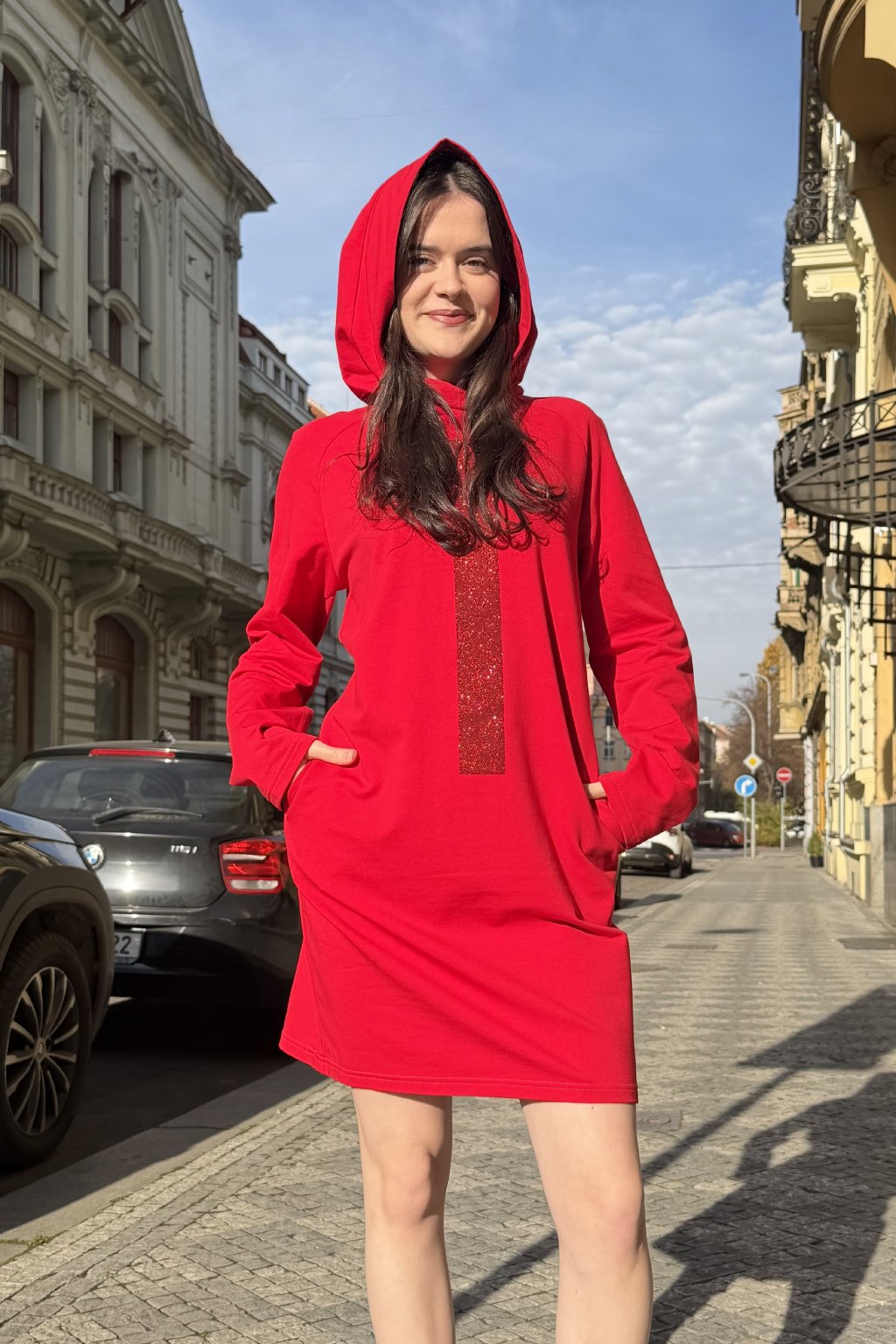 Potisk GLITTER se krásně třpytí, hodí se na slavnostnější chvíle a dodáva šatům punc vyšší elagance. Šaty jsou rovného střihu. Dlouhý raglánový rukáv. Boční kapsy.