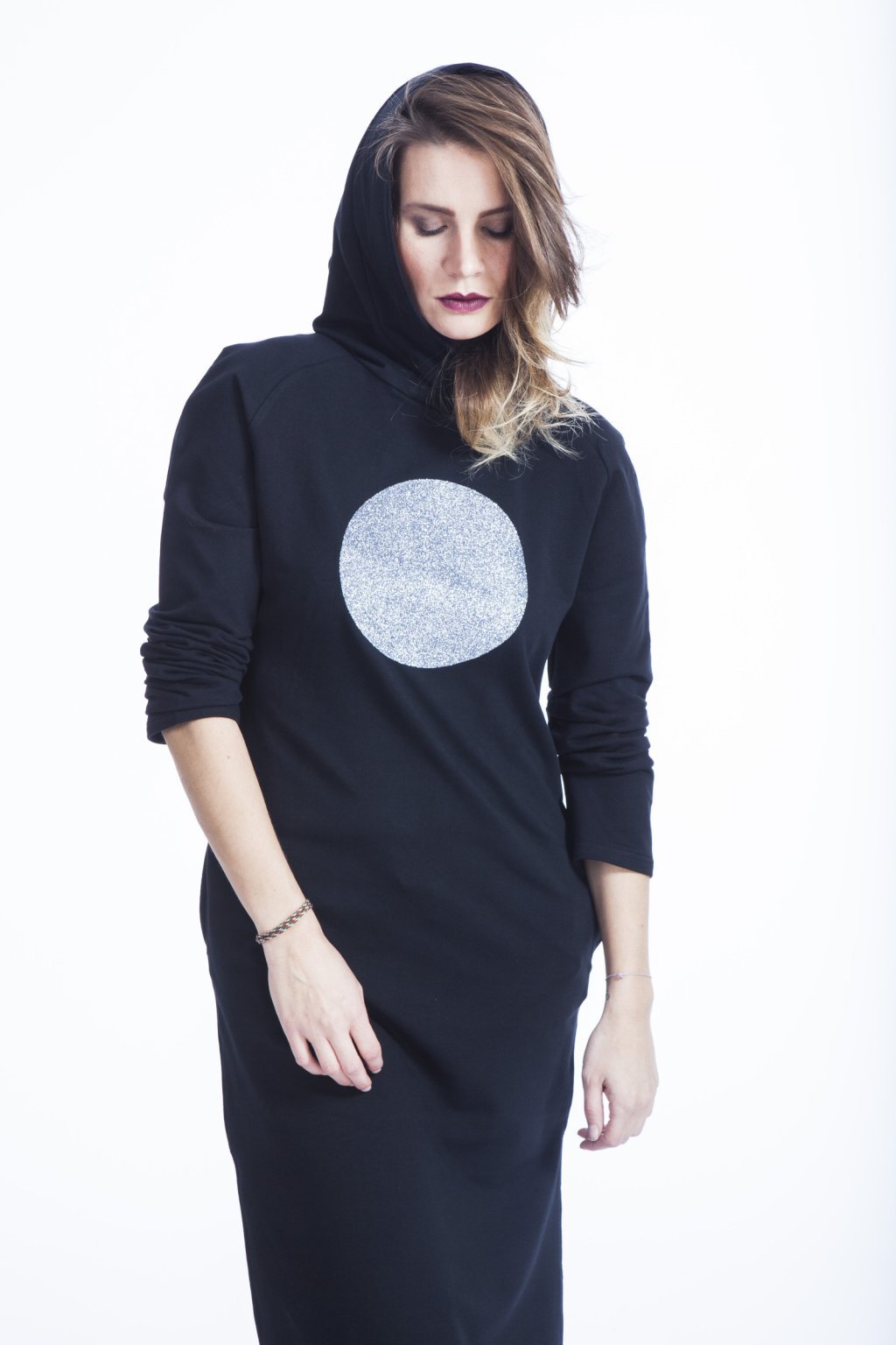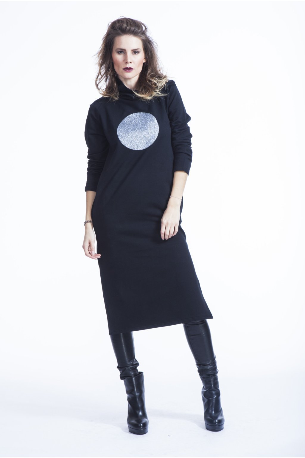Potisk GLITTER se krásně třpytí, hodí se na slavnostnější chvíle a dodává šatům punc vyšší elagance. Šaty jsou rovného střihu. Dlouhý raglánový rukáv. Boční kapsy. Rozparky po stranách.