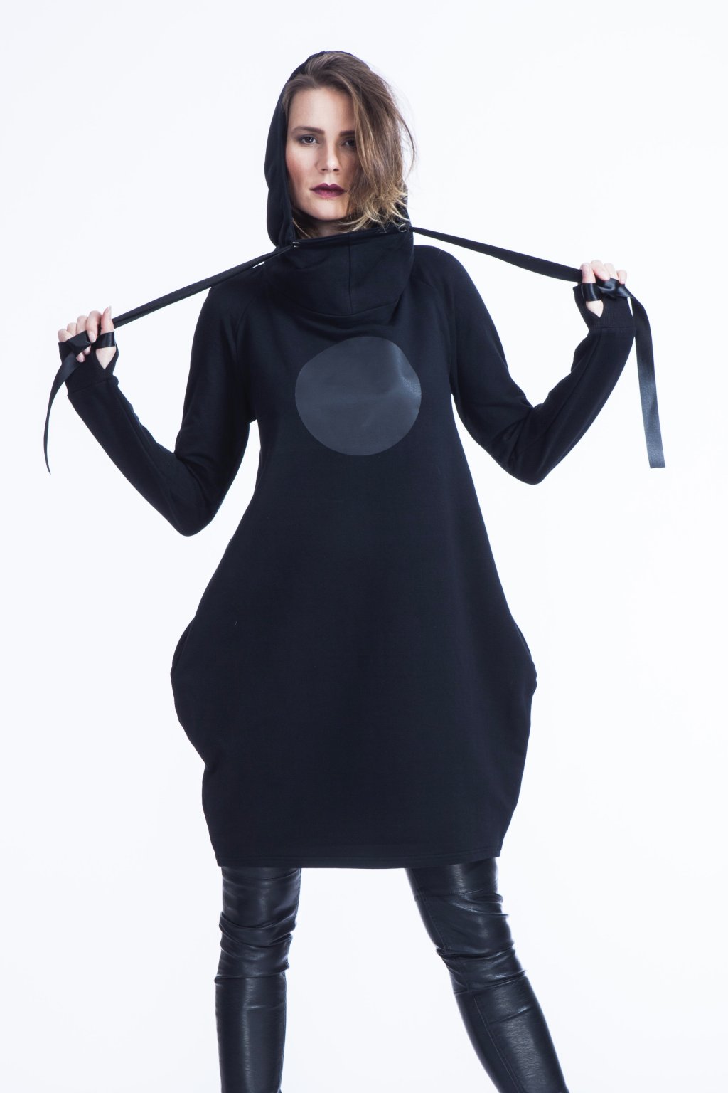 Skvěle kombinovatelné, lichotivé černé mikinošaty, s dlouhým rukávem, s kapucí podšitou saténem a saténovou stuhou, s potiskem geometrického černého kruhu