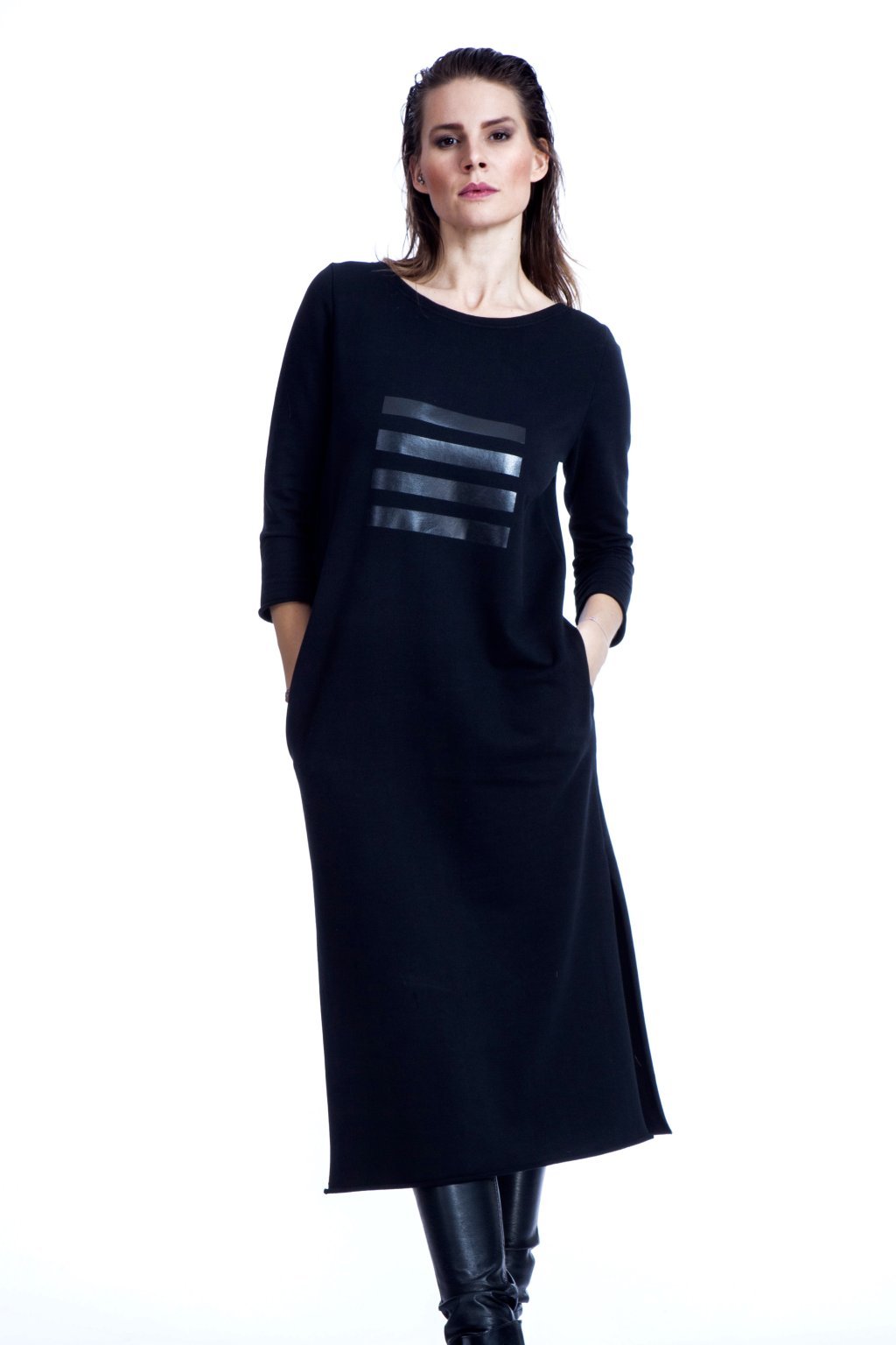 Šaty jsou rovného střihu, stejně široké v prsou a v bocích. Lodičkový výstřih. 3/4 všívaný rukáv, boční kapsy a rozparky po stranách.