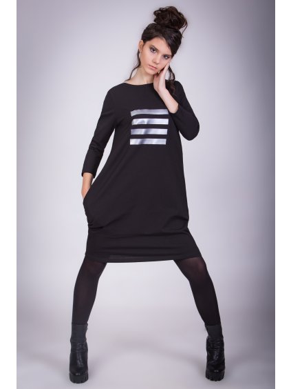 Černé úpletové šaty s minimalistickým bílým potiskem v midi délce. Šaty jsou rovného střihu, stejně široké v prsou a v bocích. Lodičkový výstřih. Krátký kimono rukáv. Boční kapsy.