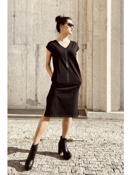 Šaty jsou rovného střihu, stejně široké v prsou a v bocích. Lodičkový výstřih. Krátký kimono rukáv. Boční kapsy.