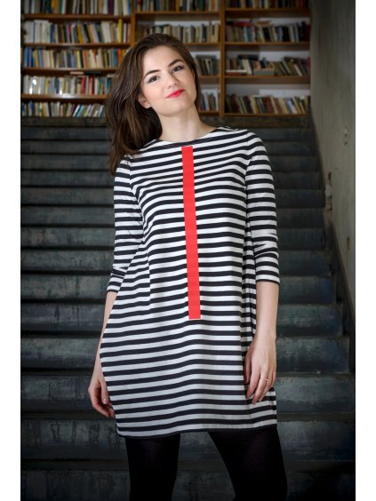 Šaty jsou rovného střihu, stejně široké v prsou a v bocích. Lodičkový výstřih. Krátký kimono rukáv. Boční kapsy.