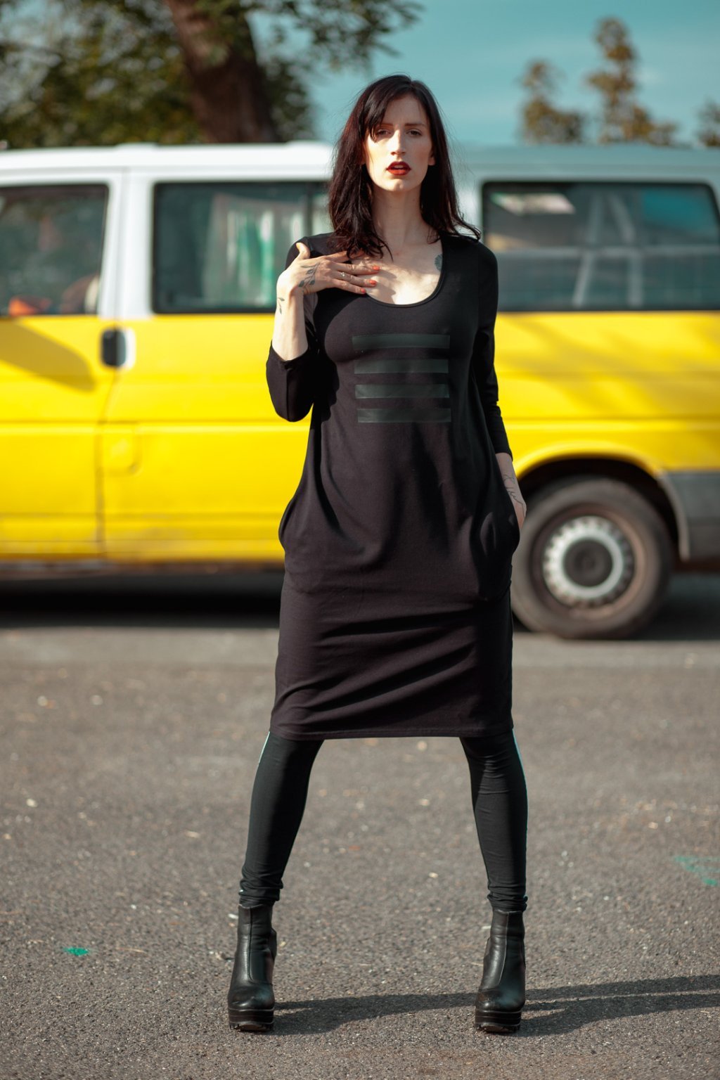 Šaty jsou rovného střihu, stejně široké v prsou a v bocích. Kulatý hlubší výstřih. 3/4 všívaný rukáv. Boční kapsy.