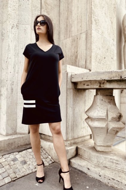 Šaty jsou rovného střihu, stejně široké v prsou a v bocích. Od boků dolů se mírně zužují a nechají tak vyniknout ženské siluetě, hluboké rozparky po stranách, bez kapes. Výstřih do V. Bez rukávu (spadlý rukáv).