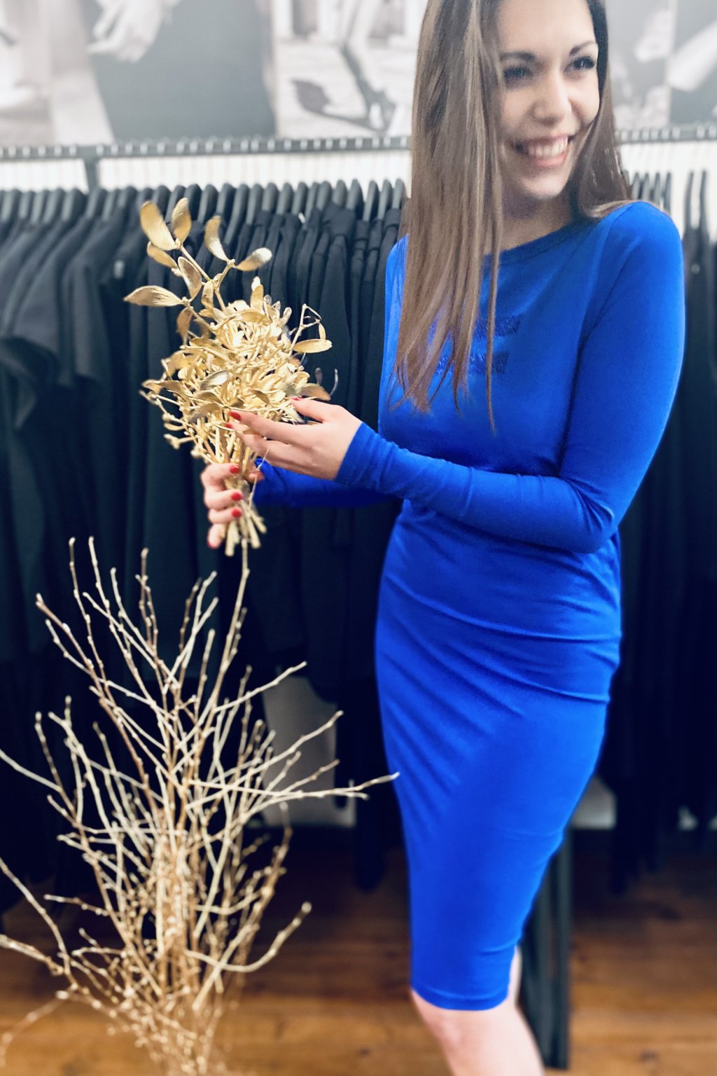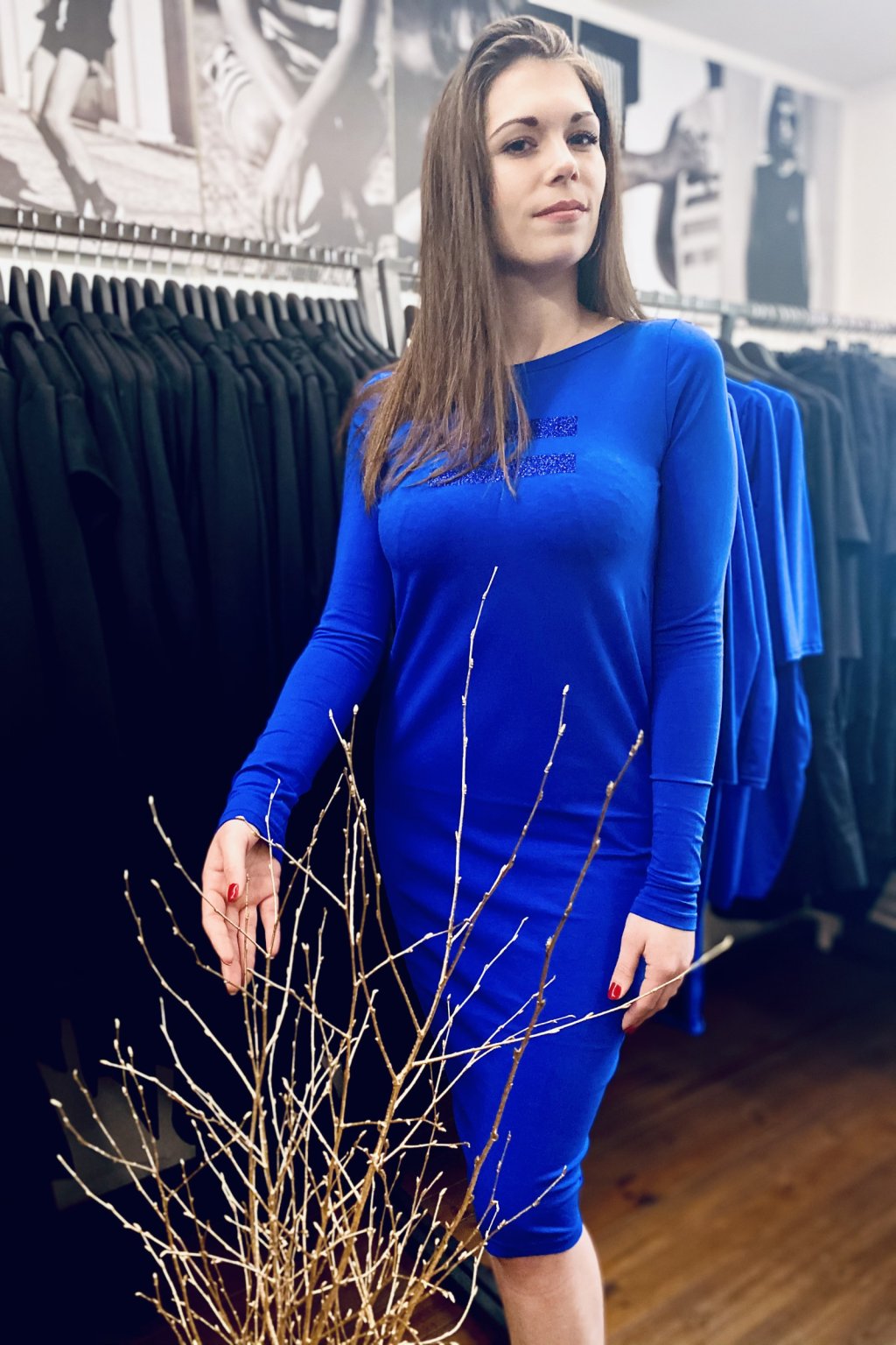 Potisk GLITTER se krásně třpytí, hodí se na slavnostnější chvíle a dodává šatům punc vyšší elagance. Šaty jsou rovného střihu, stejně široké v prsou a v bocích. Od boků dolů se mírně zužují a nechají tak vyniknout ženské siluetě. Lodičkový výstřih. Dlouhatánský od lokte zužující se všívaný rukáv. Pro podtržení minimalizmu jsou okraje na rukávu nezačistěny.