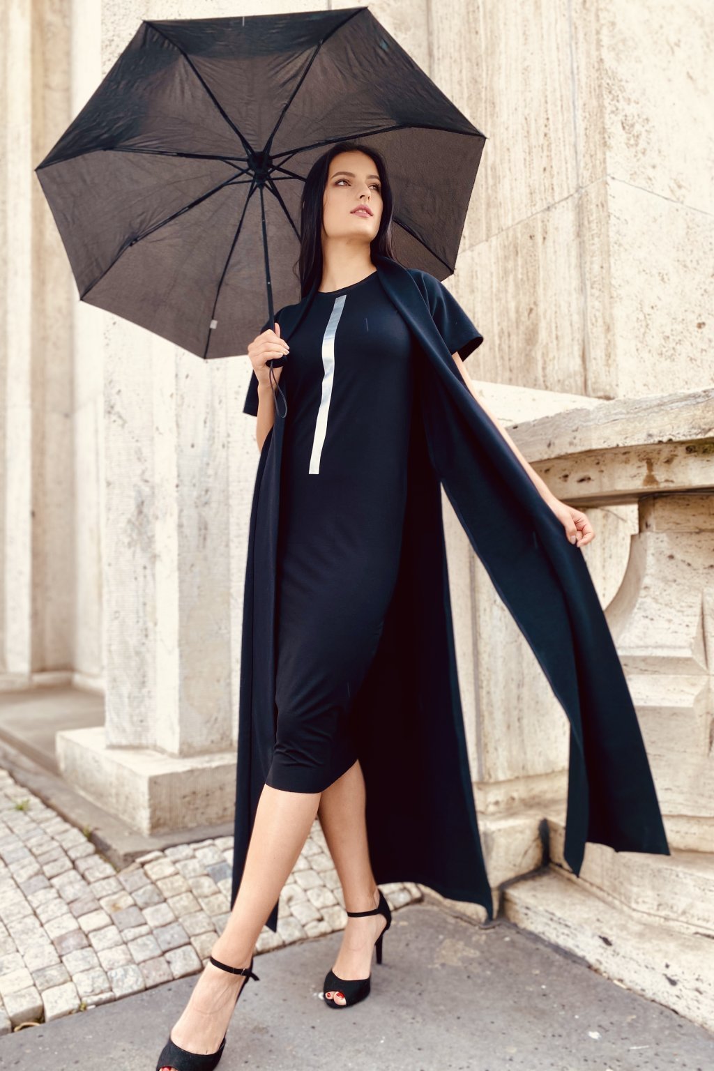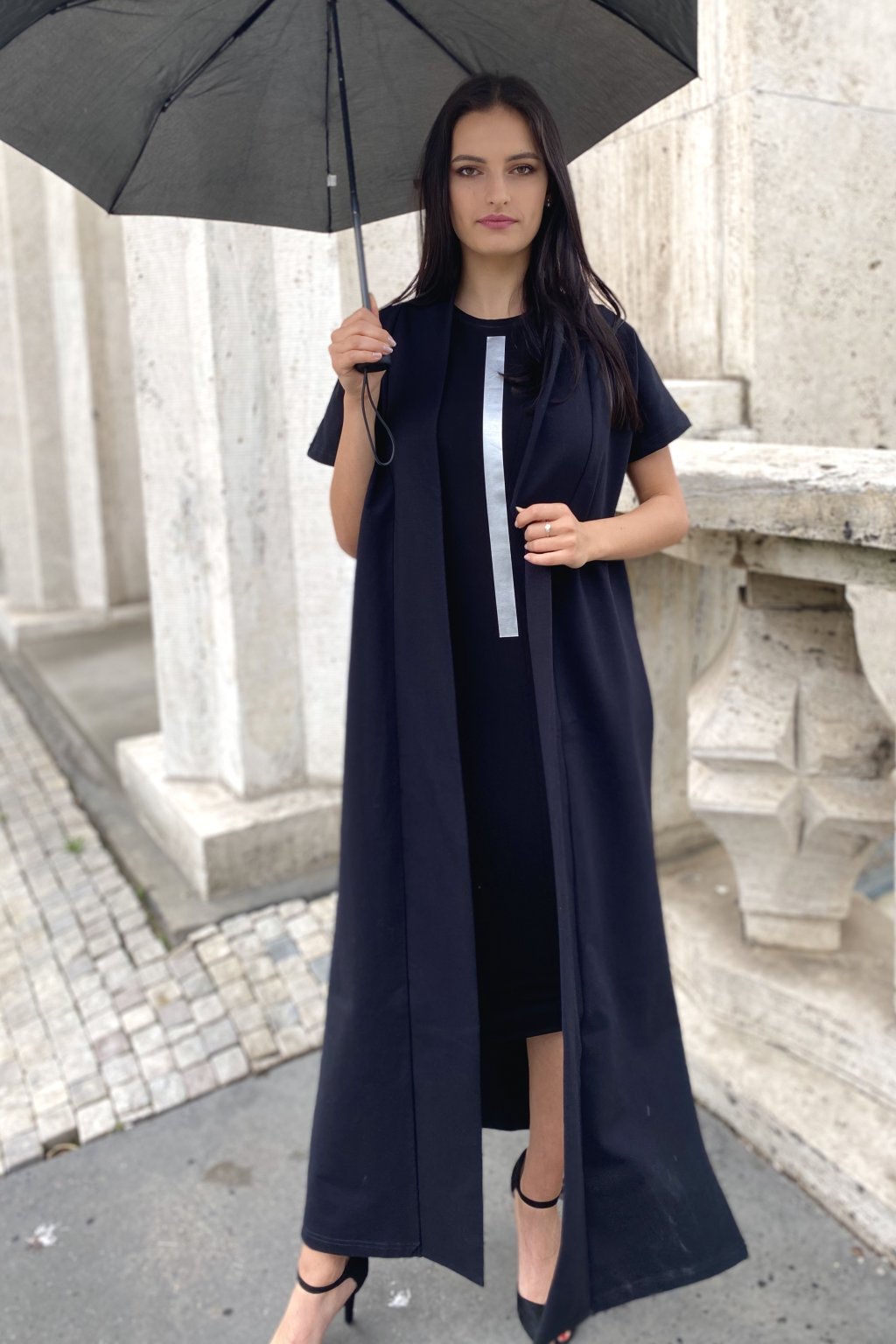 Černá dlouhá vesta se šálovým lemem je ušitá z elastické teplákoviny. Je rovného střihu a má kimono krátký rukáv a hodně hluboké rozparky po stranách.