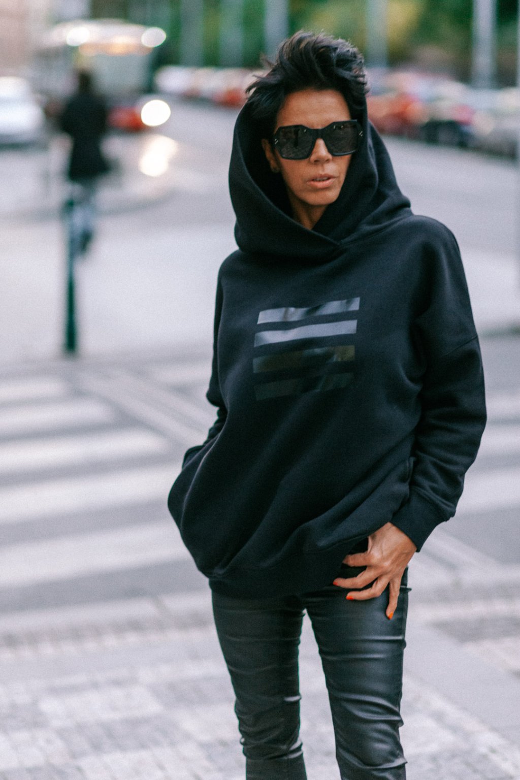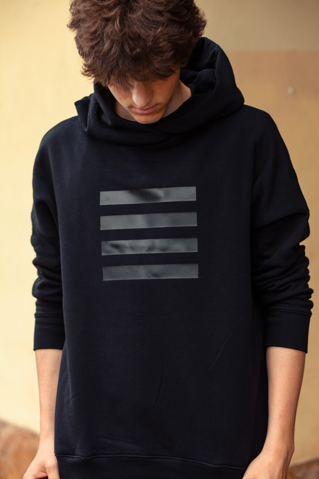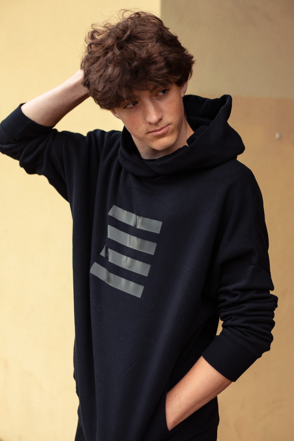Mikina je hřejivá a velmi příjemná na nošení. Šijeme ji z počesané teplákoviny vyšší gramáže. Basic střih je mírně upraven do oversized, v ramenou je mikina široká a rukávy jsou směrem k zápěstí trochu zúžené. Švy jsou precizně prošité i zevně. Naddimenzovaná kapuce s širokým lemem, geometrický potisk a kapsy z ní dělají stylový kousek, který se výborně nosí a je skvěle kombinovatelný s kraťasy, tepláky a kalhoty z naší nabídky.