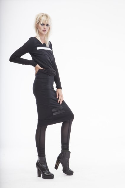 Tričko je netopýřího střihu, v ramenou široké, v bocích zúžené, s kimono krátkým rukávem se začištěnými okraji. Spodní lem trička je nezačištěný. Lodičkový výstřih.