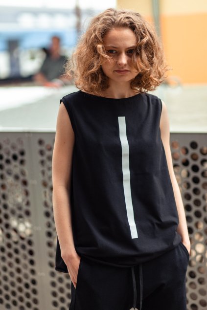Triko je úzké, v bocích víc zúžené, úzký dlouhatánský všívaný rukáv, okraje nezačištěné. Lodičkový výstřih.