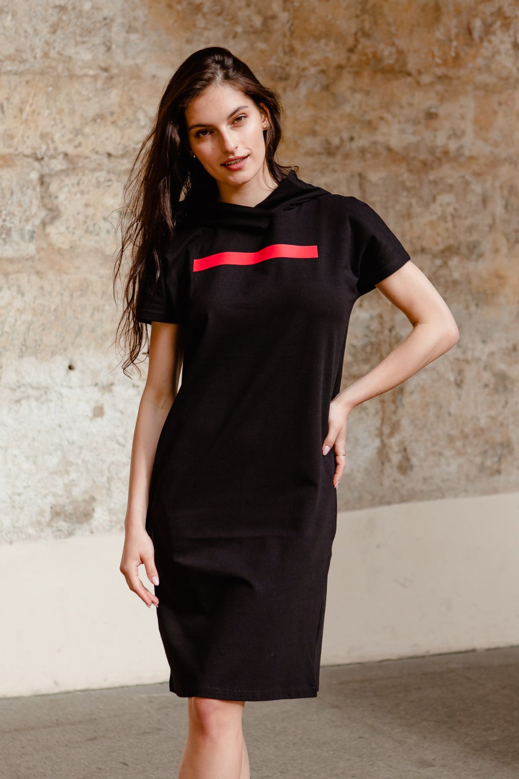 Šaty jsou rovného střihu, stejně široké v prsou a v bocích. Kimono rukáv, kapuce. Boční kapsy.