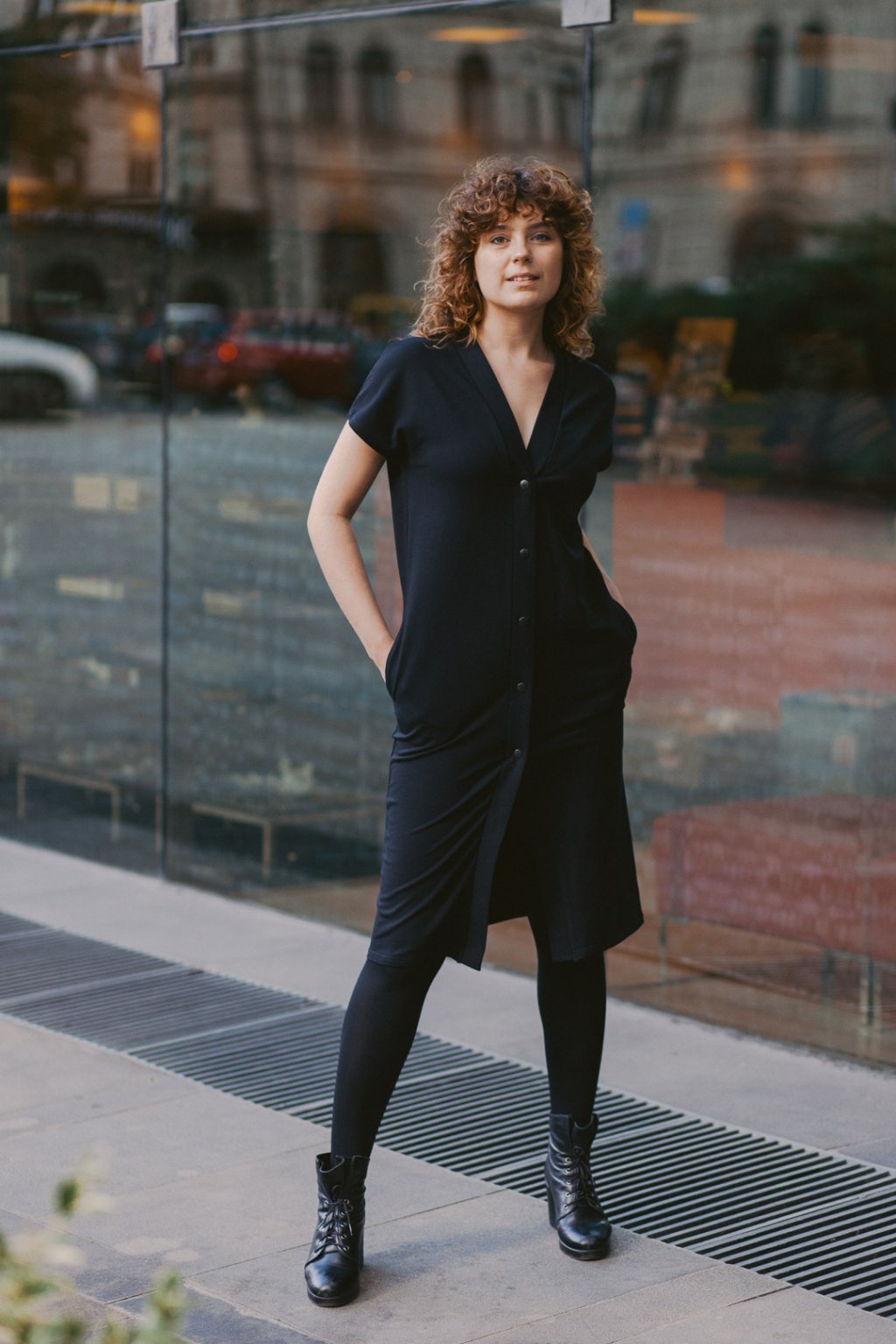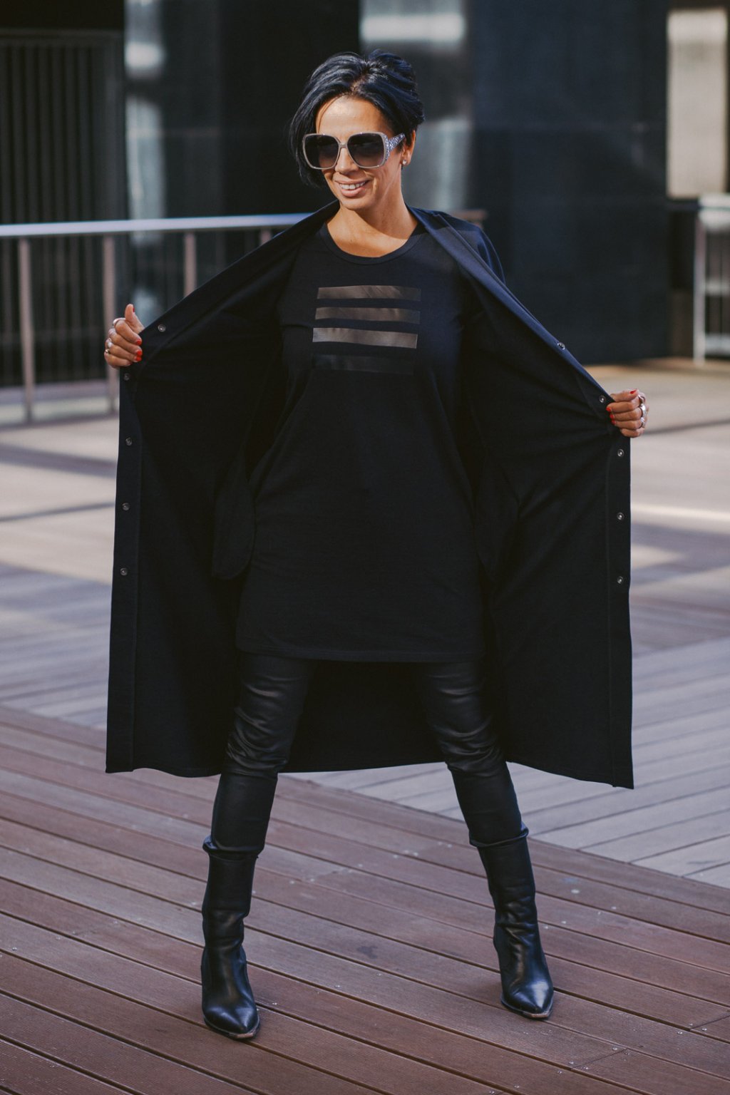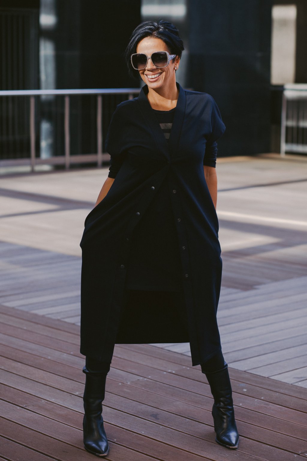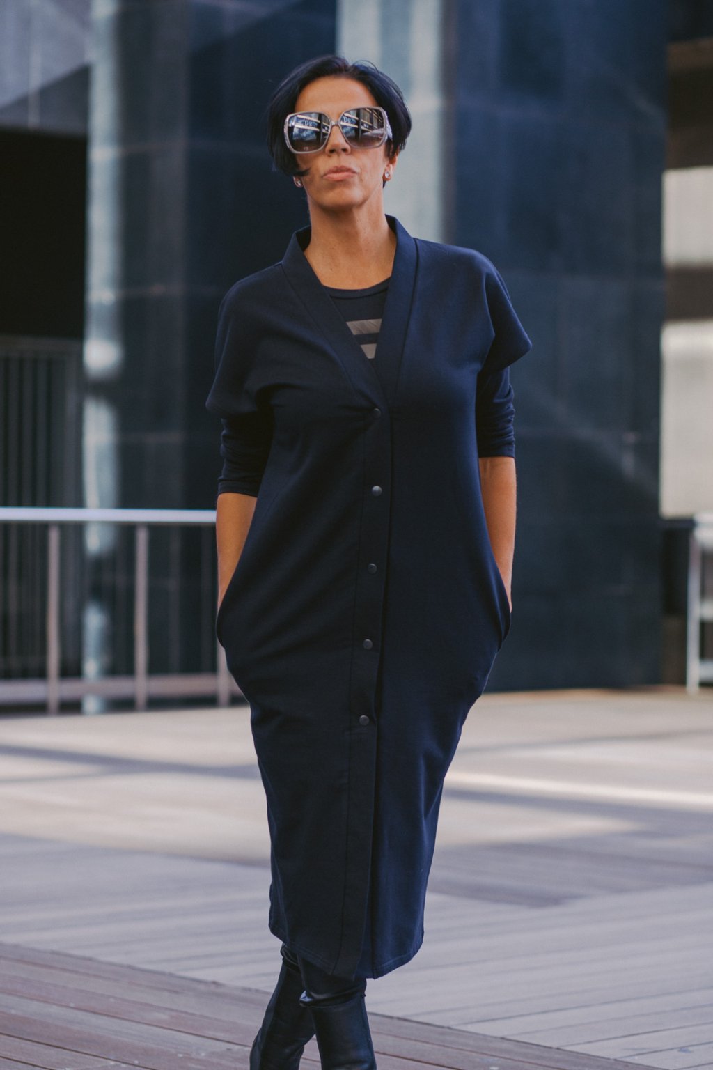 Mikinošaty/vesta rovného střihu. V midi délce, s kimono rukávem a výstřihem do véčka. Zapínání na druky. Boční kapsy z ní dělají velmi praktický kousek, který je skvěle kombinovatelný a vhodný pro oblíbené vrstvení.