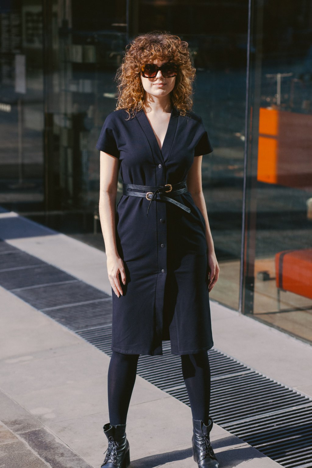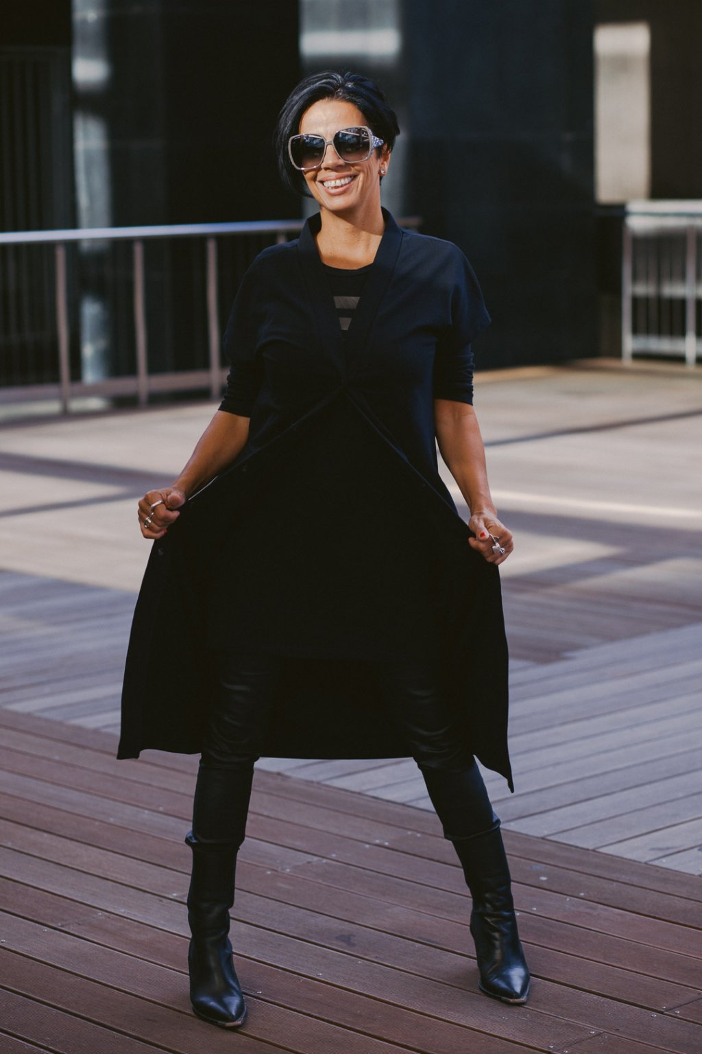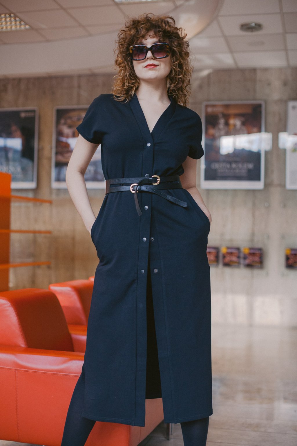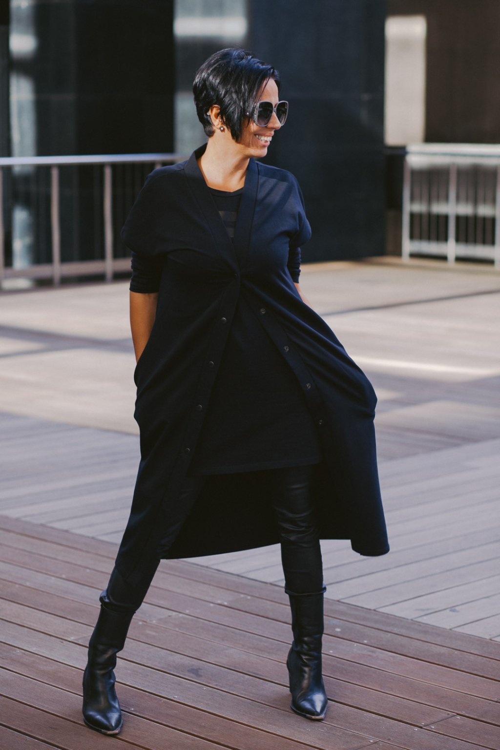 Mikinošaty/vesta rovného střihu. V midi délce, s kimono rukávem a výstřihem do véčka. Zapínání na druky. Boční kapsy z ní dělají velmi praktický kousek, který je skvěle kombinovatelný a vhodný pro oblíbené vrstvení.