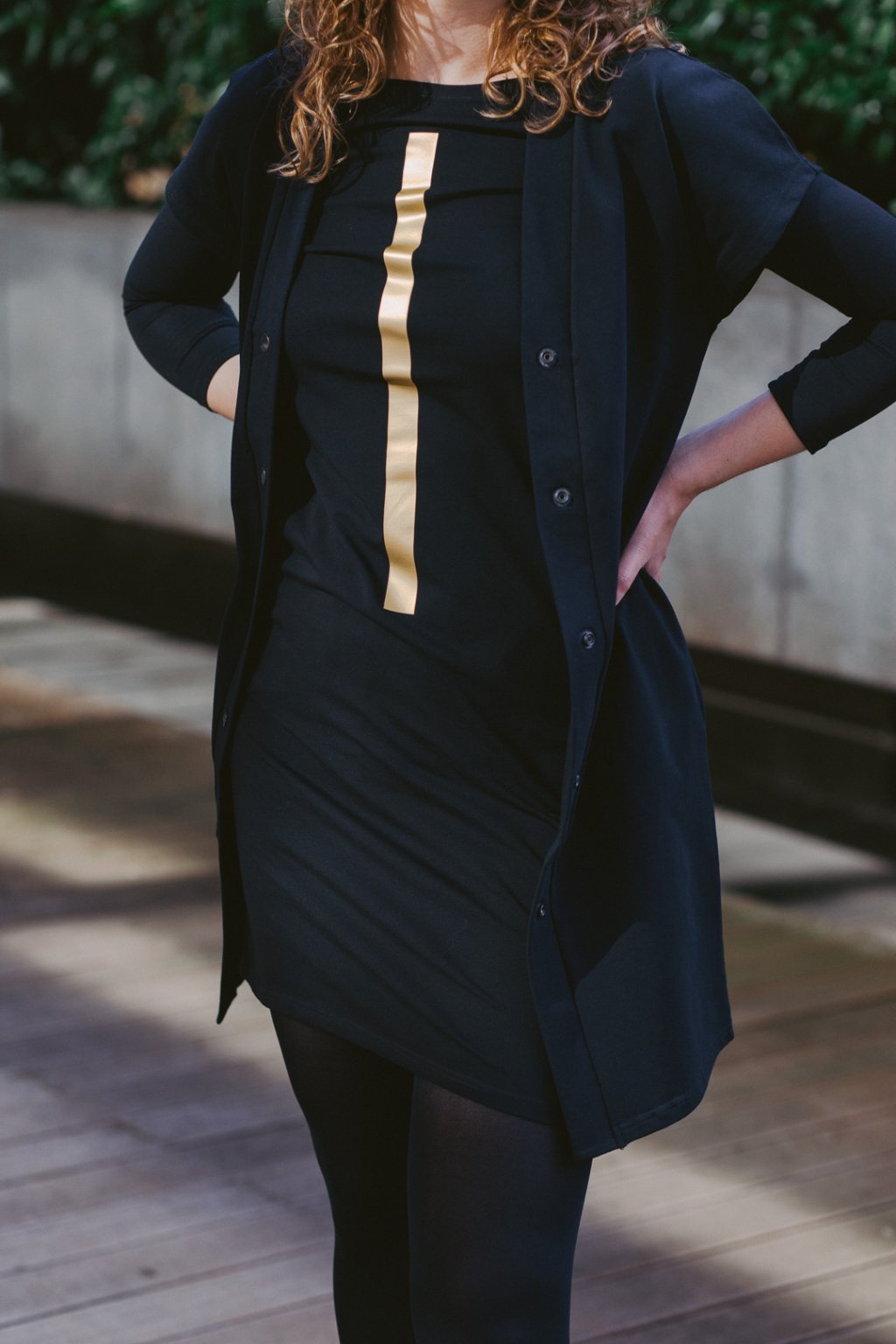 Šaty jsou rovného střihu, stejně široké v prsou a v bocích. Lodičkový výstřih. 3/4 všívaný rukáv. Boční kapsy.