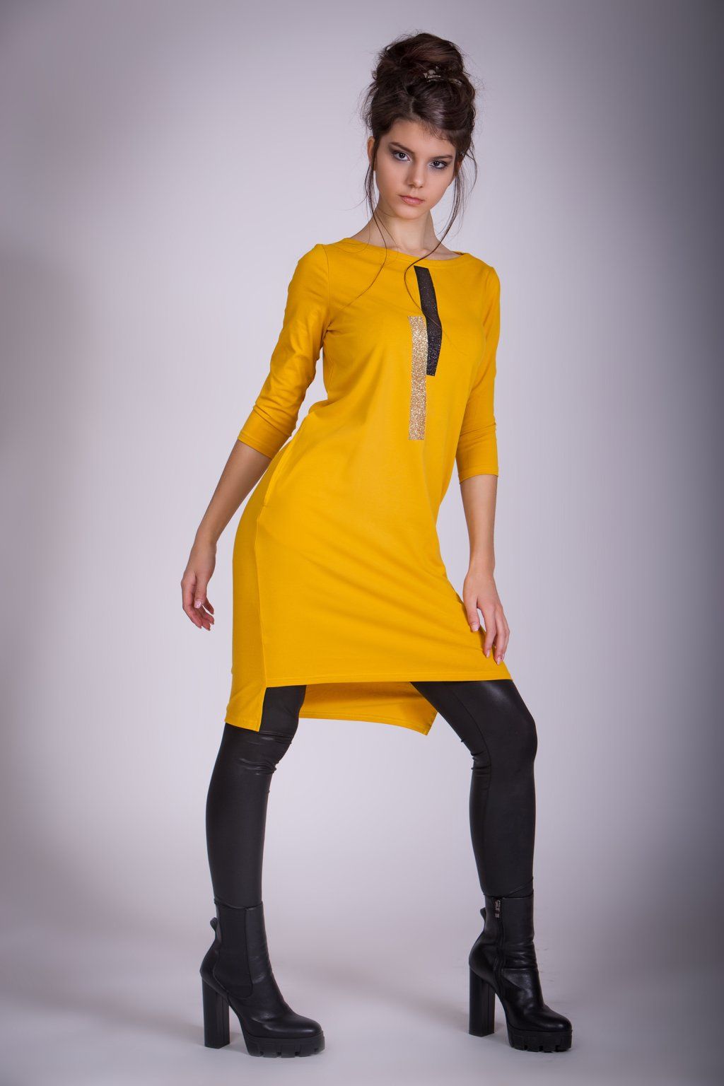 Šaty jsou rovného střihu, zadní díl je prodloužený. 3/4 všívaný rukáv. Boční kapsy.