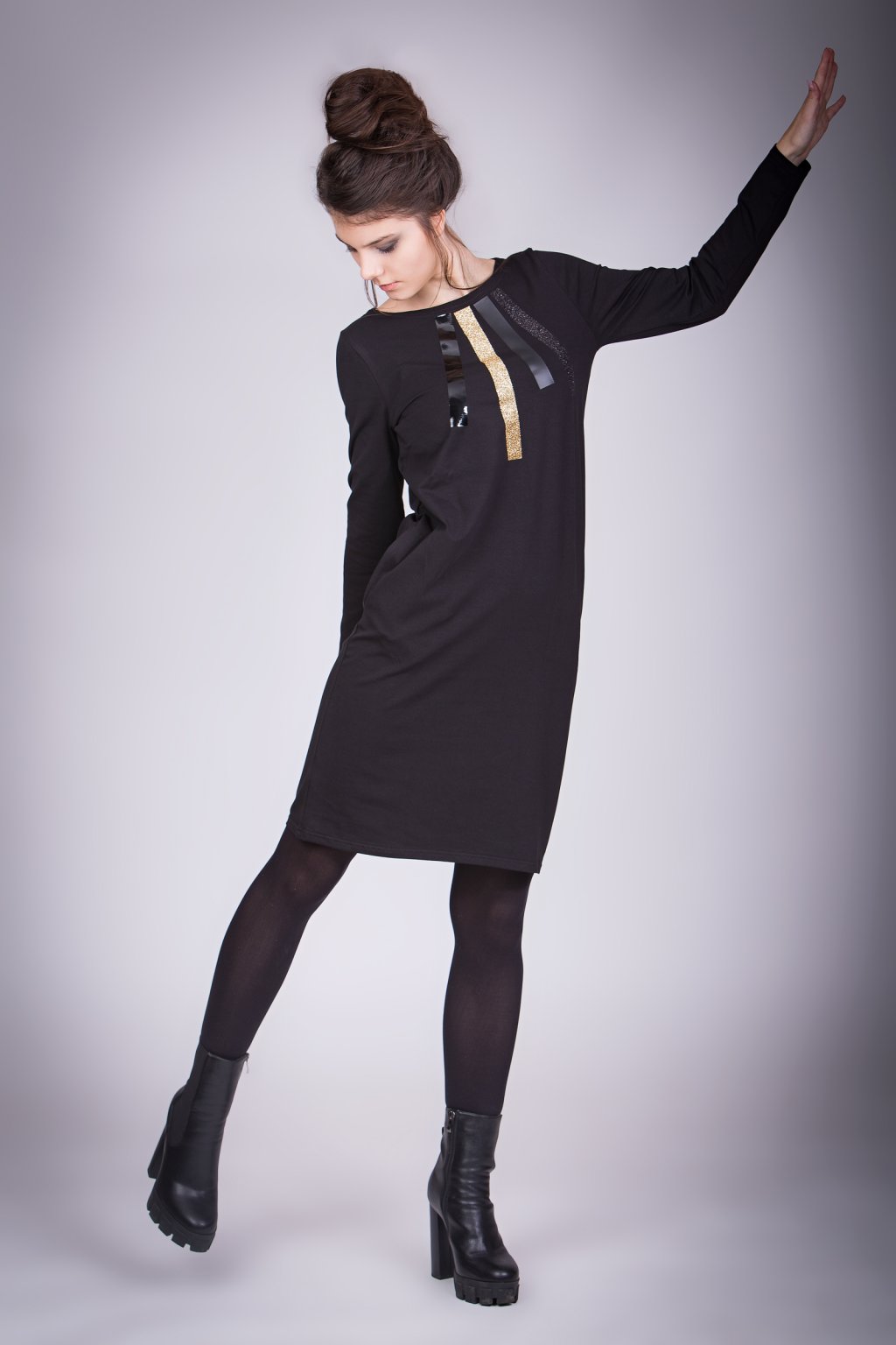 Potisk GLITTER se krásně třpytí, hodí se na slavnostnější chvíle a dodává šatům punc vyšší elagance. Šaty jsou rovného střihu, stejně široké v prsou a v bocích. Lodičkový výstřih. Dlouhý rukáv. Boční kapsy.