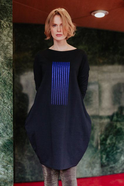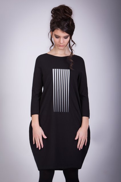 Šaty mají lodičkový výstřih a všívaný dlouhý rukáv.