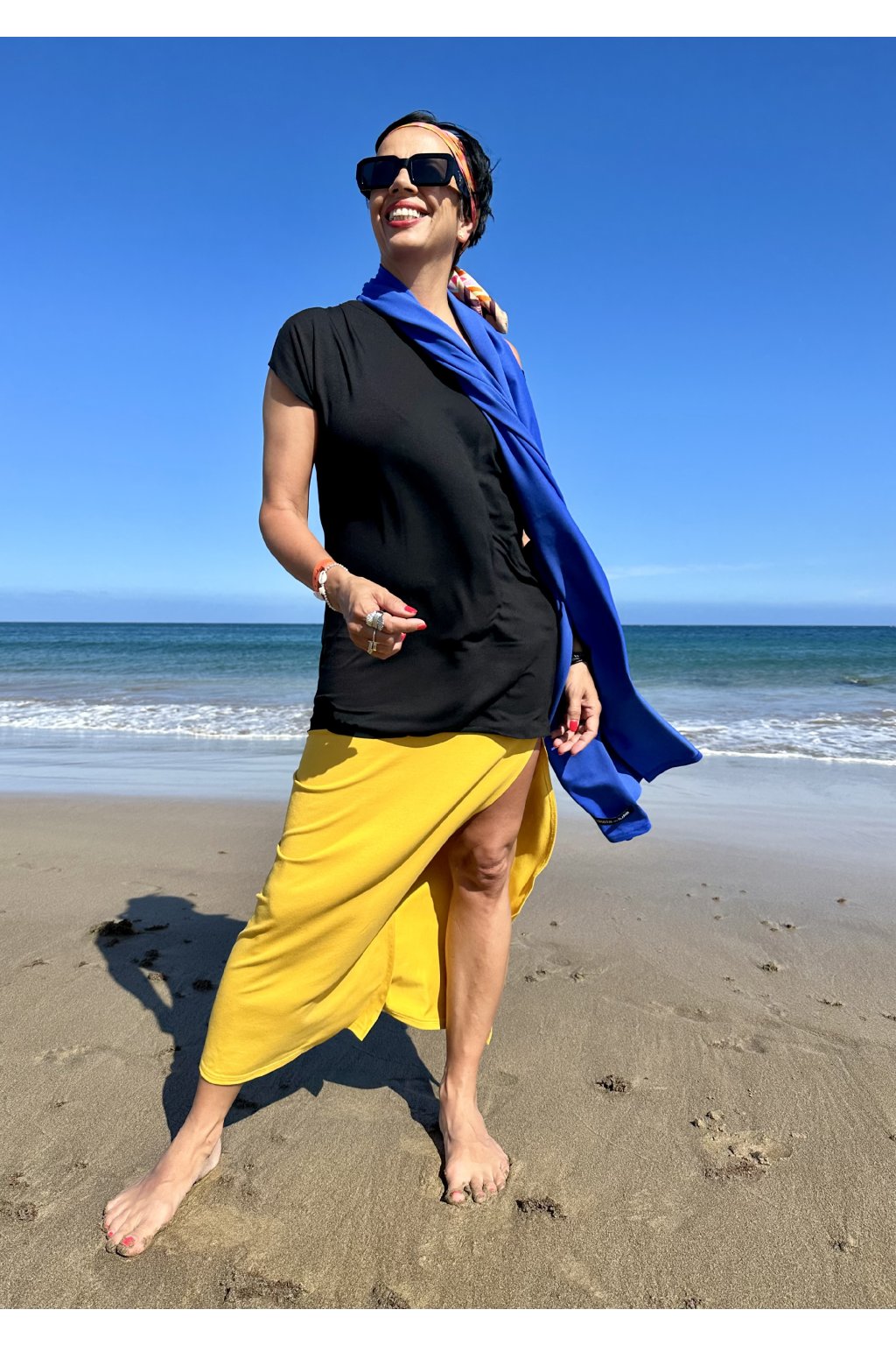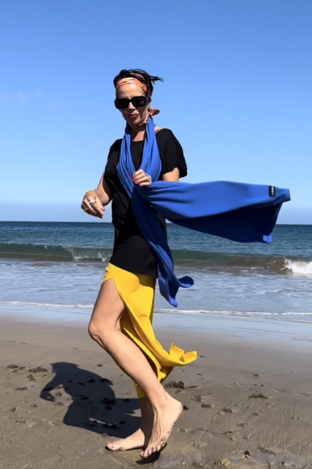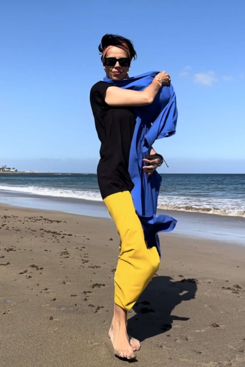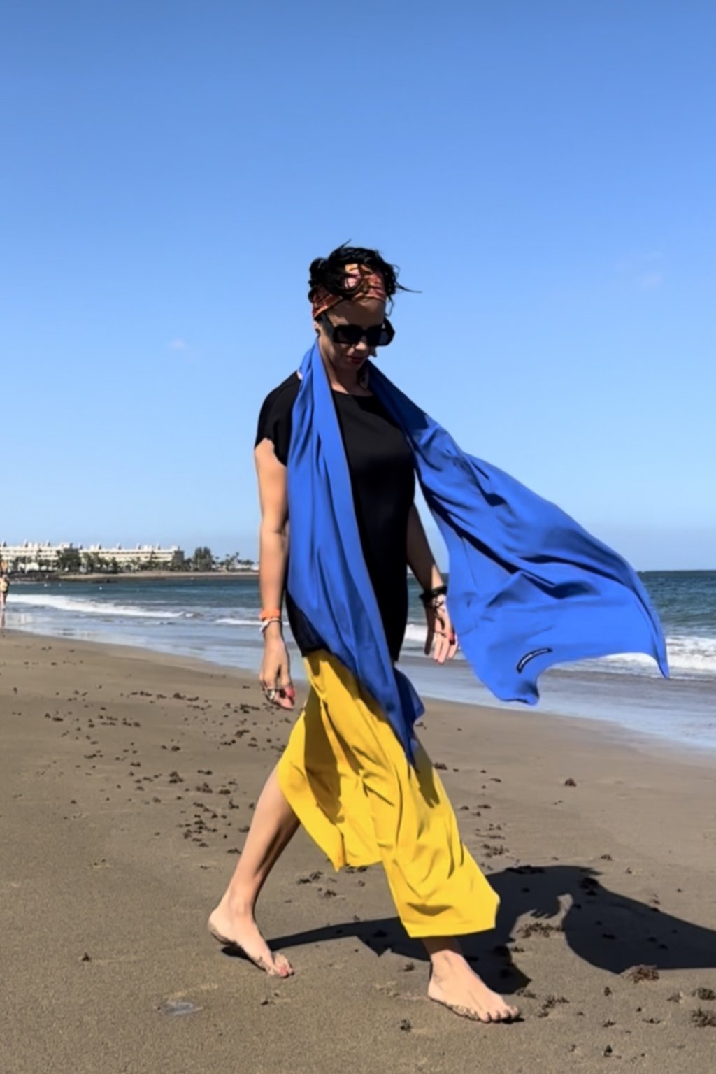 Rozměry šály 220cm (délka) a 45cm (šířka). Delší protilehlé okraje jsou nezačištěné.