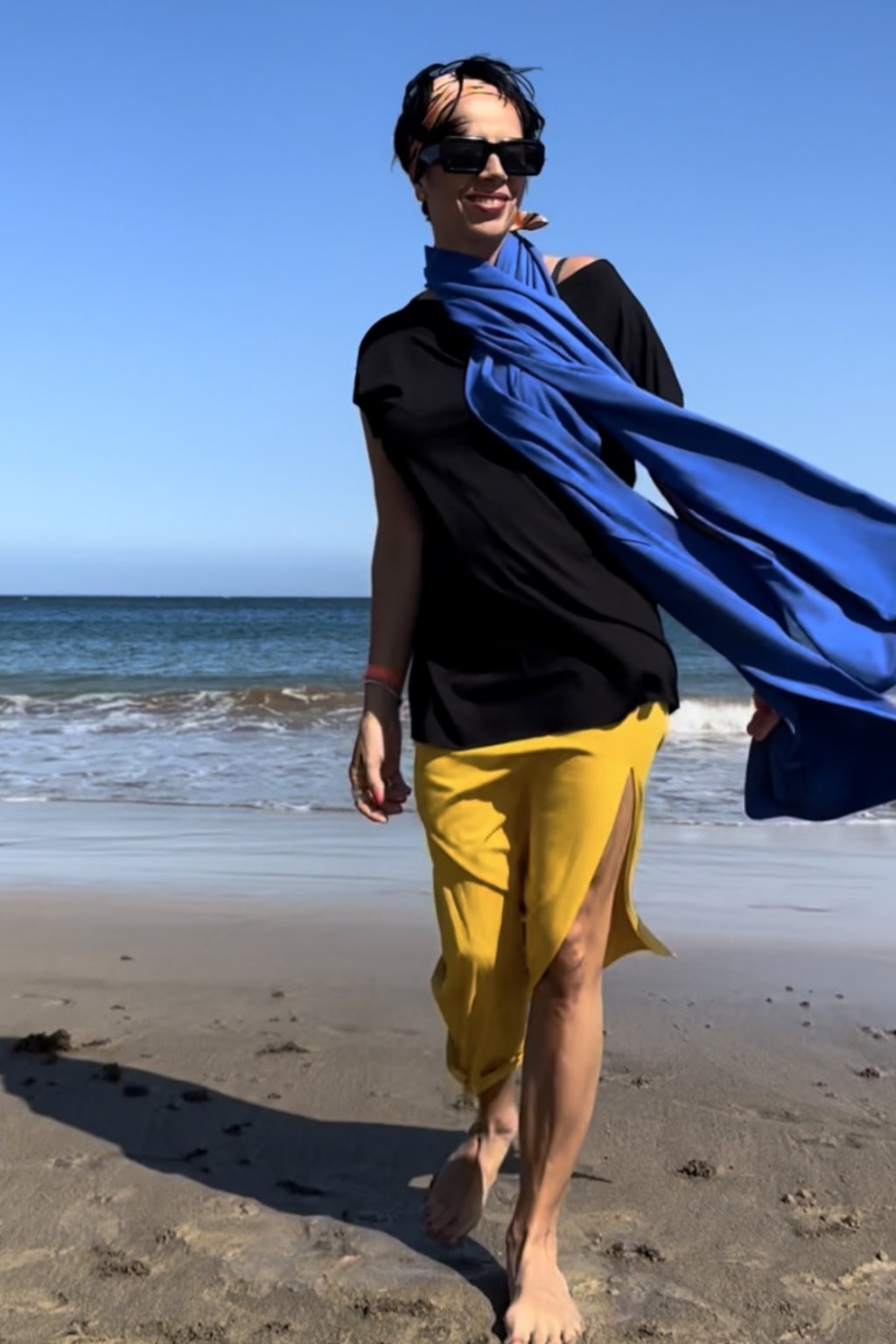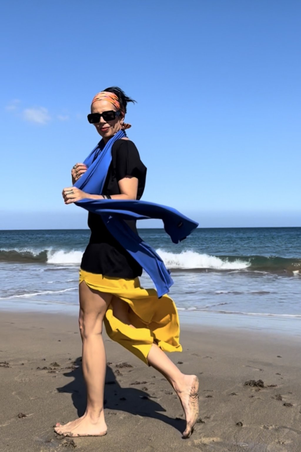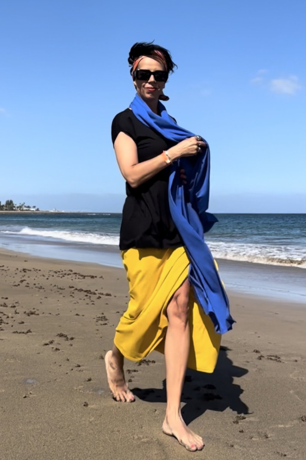 Rozměry šály 220cm (délka) a 45cm (šířka). Delší protilehlé okraje jsou nezačištěné.