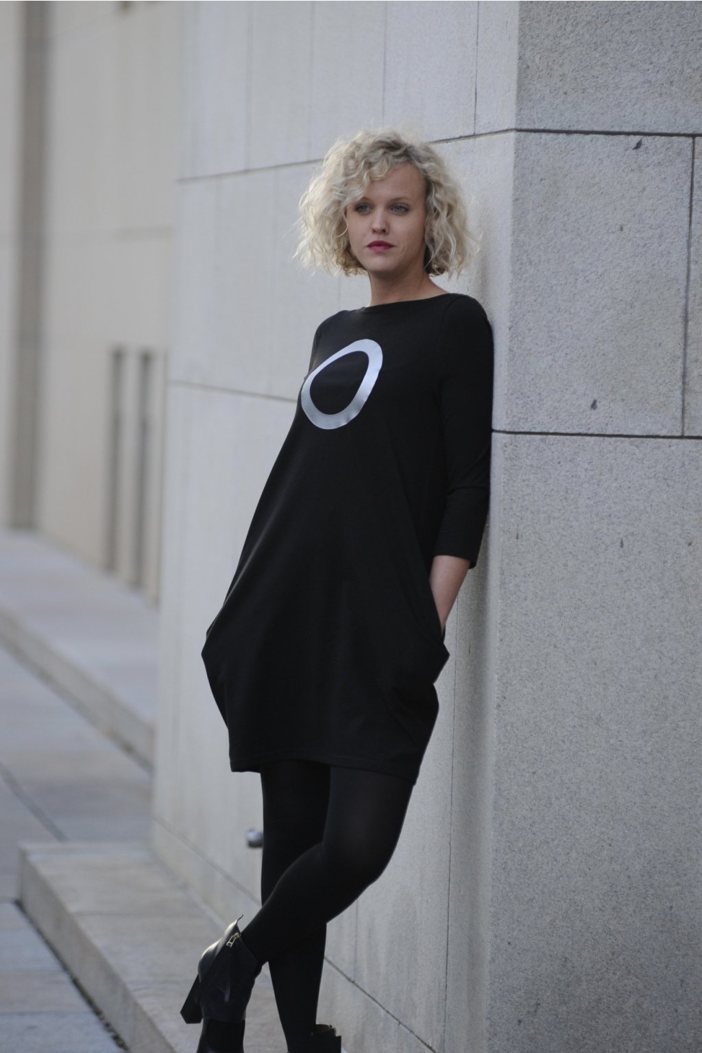 Šaty se směrem dolů rozšiřují, pak zaoblují a zužují. Boční kapsy. 3/4 všívaný rukáv. Lodičkový výstřih. Potisk stříbrná kružnice.