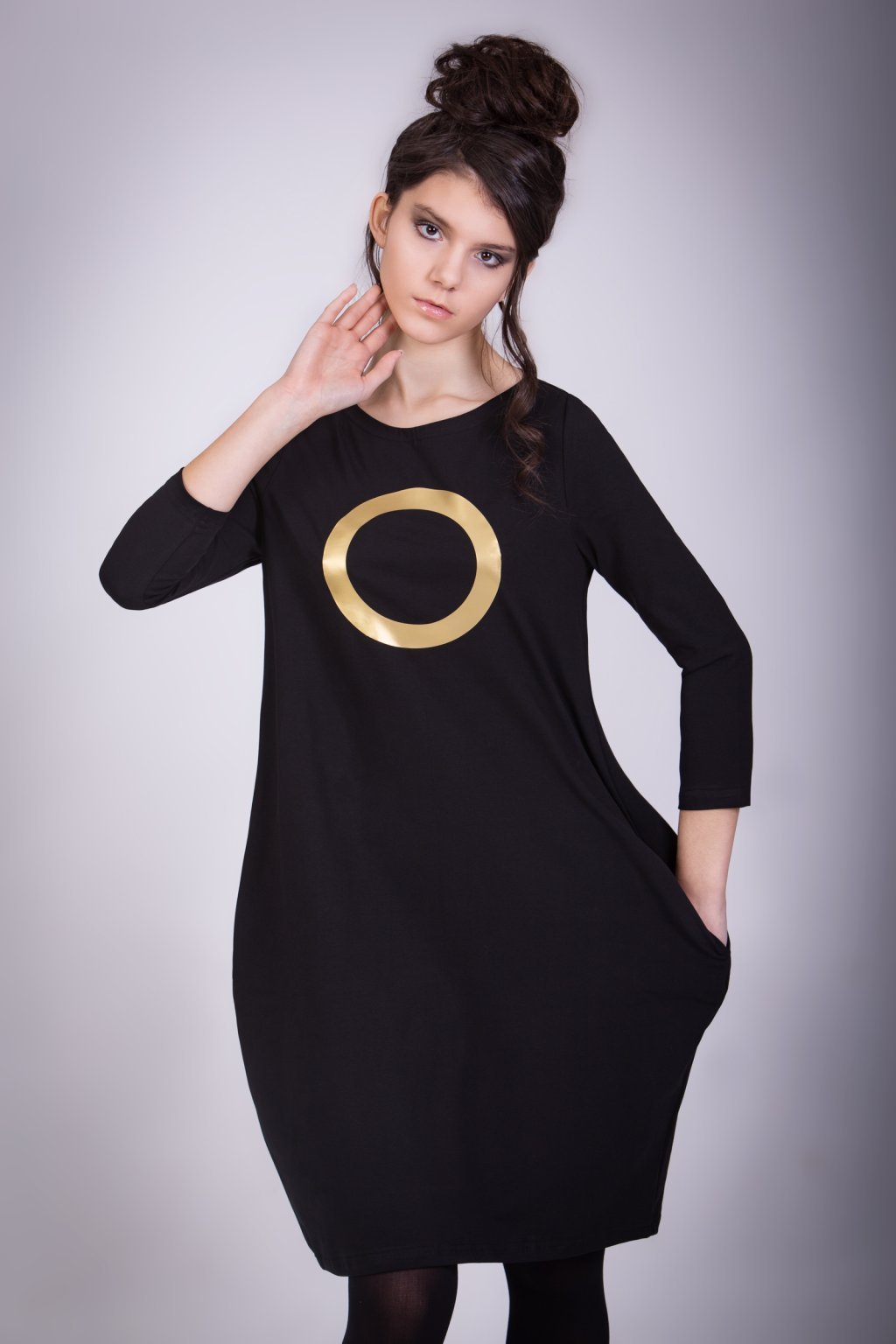 Šaty se směrem dolů rozšiřují, pak zaoblují a zužují. Boční kapsy. 3/4 všívaný rukáv. Lodičkový výstřih.