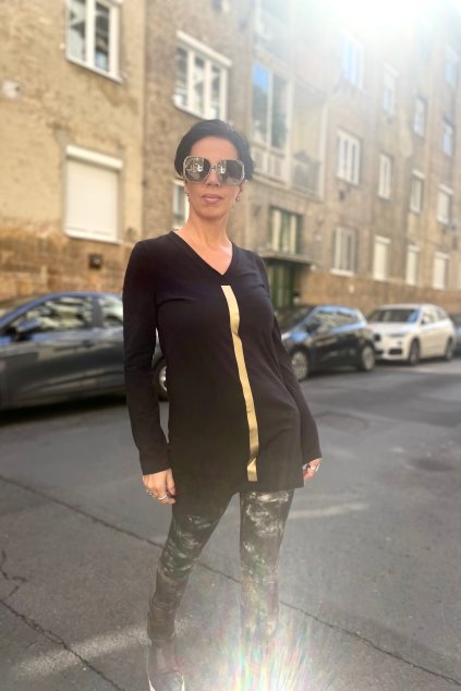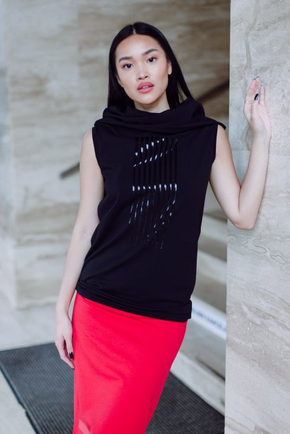 Triko je úzké, v bocích víc zúžené, úzký dlouhatánský všívaný rukáv, okraje nezačištěné. Lodičkový výstřih.