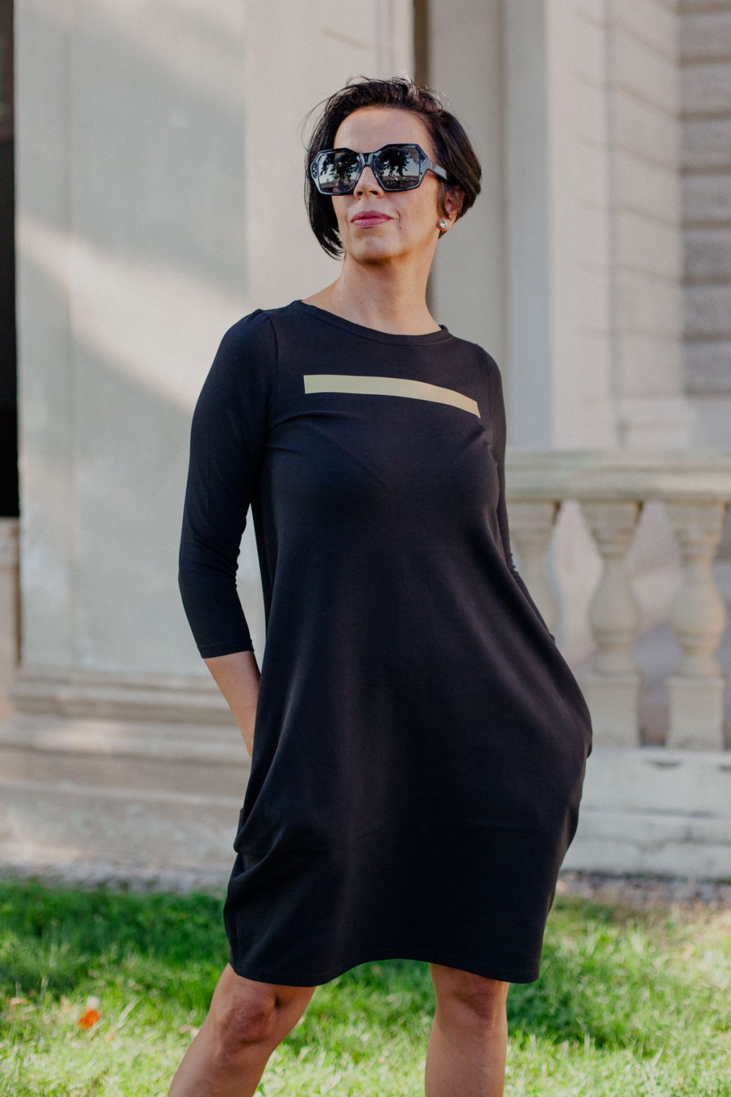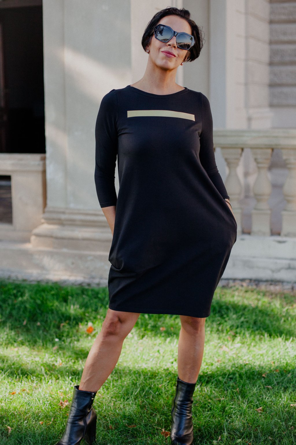 Šaty se směrem dolů rozšiřují, pak zaoblují a zužují. Boční kapsy. 3/4 všívaný rukáv. Lodičkový výstřih.