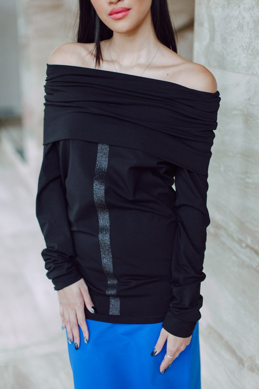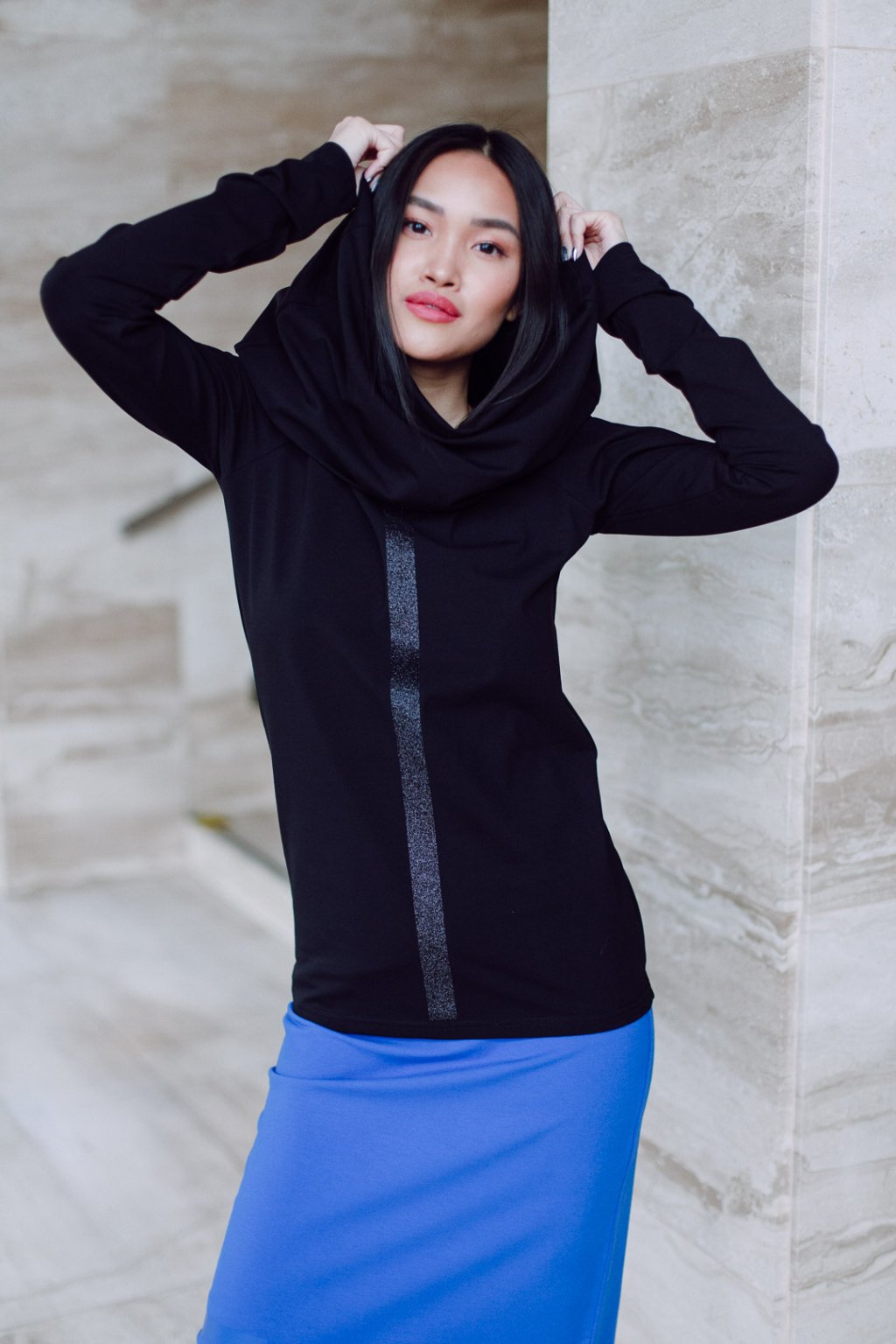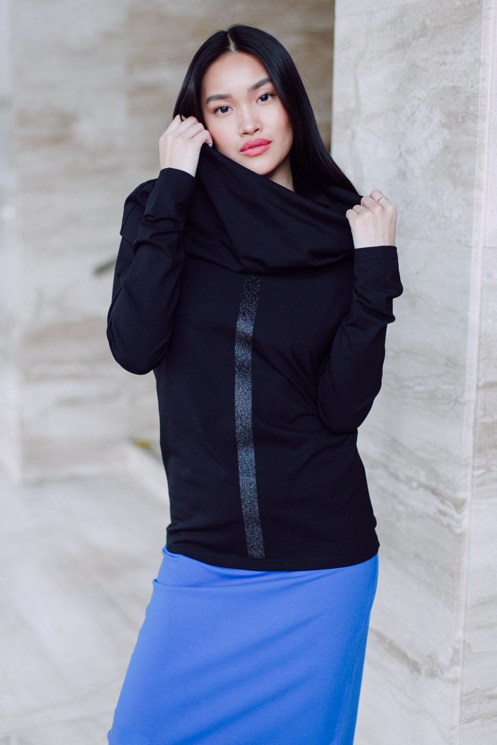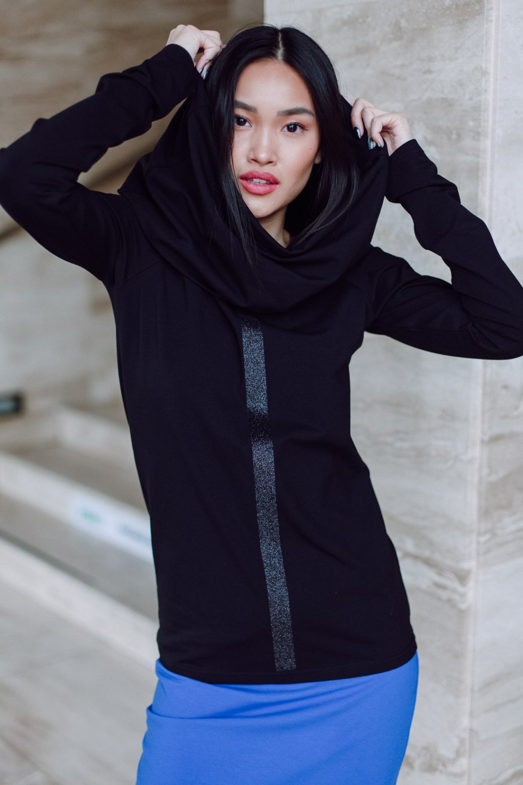 Triko s MAXI límcem, dlouhatánským raglánovým rukávem a glitter potiskem. Límec je dvojitý a směrem nahoru rozšířený, lze nosit na hlavě i vyhrnutý na ramenou nebo jen ledabyle.