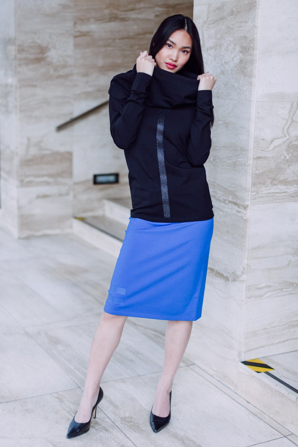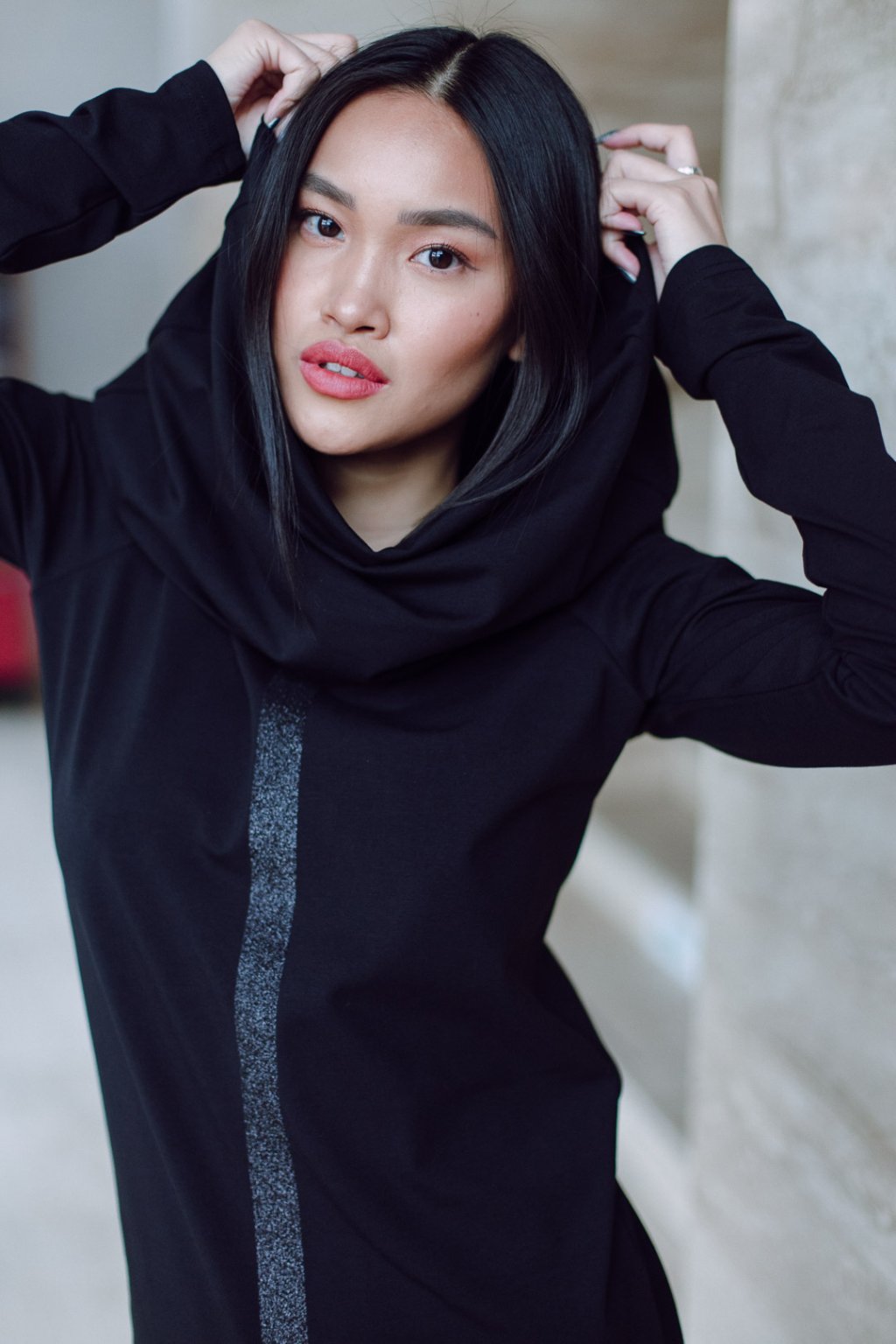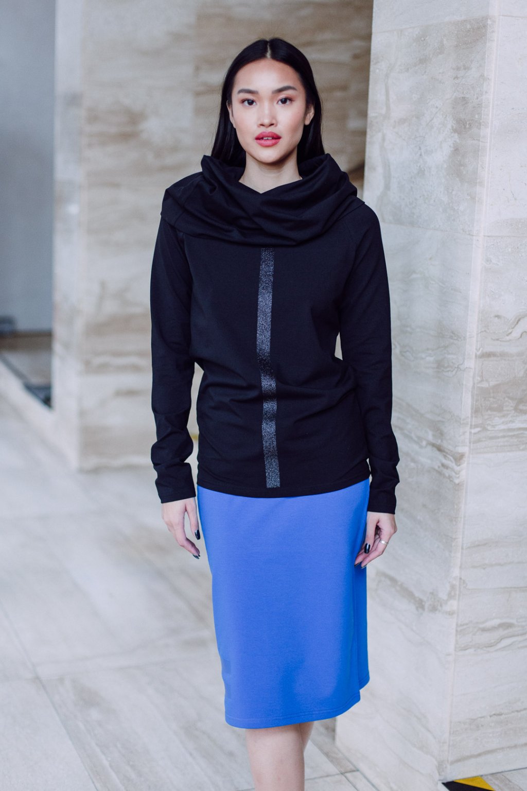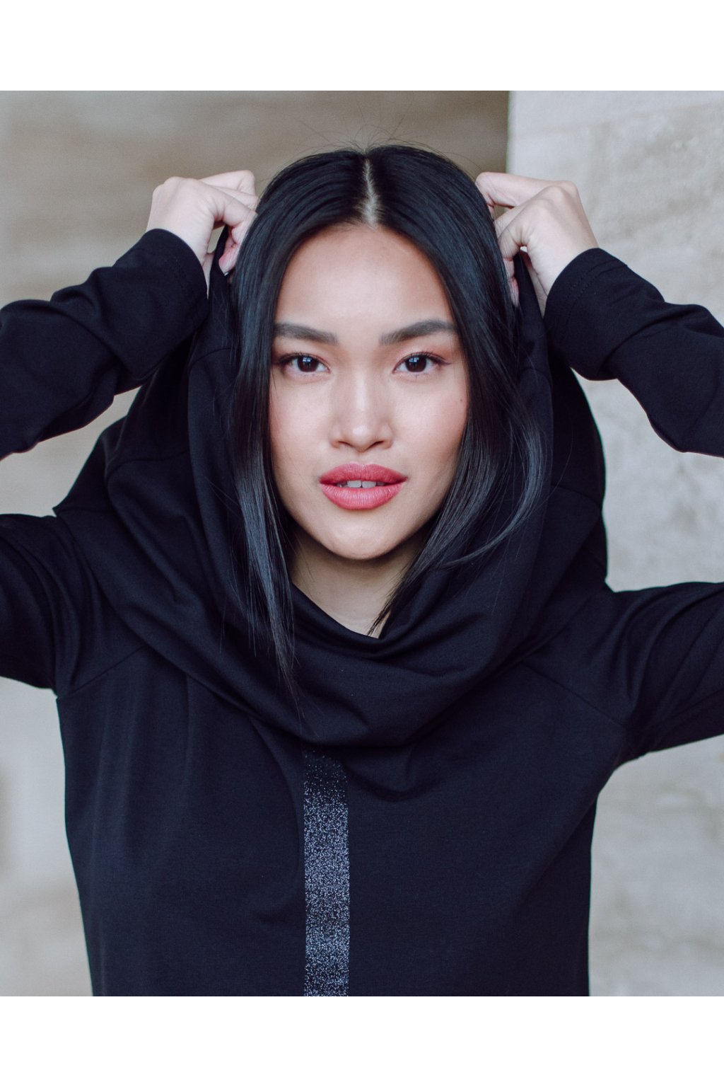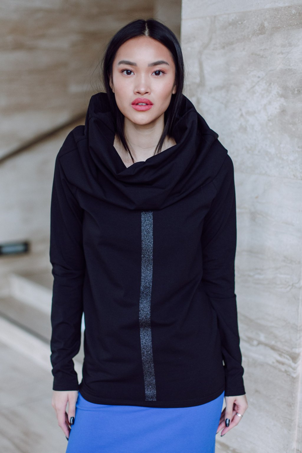 Triko s MAXI límcem, dlouhatánským raglánovým rukávem a glitter potiskem. Límec je dvojitý a směrem nahoru rozšířený, lze nosit na hlavě i vyhrnutý na ramenou nebo jen ledabyle.