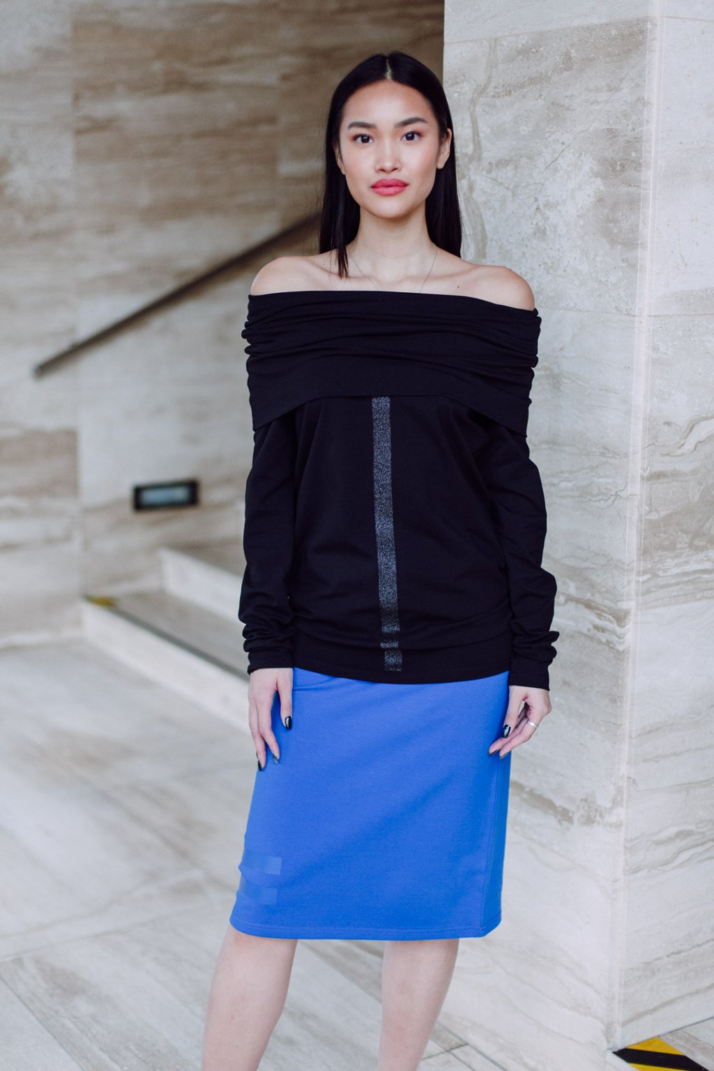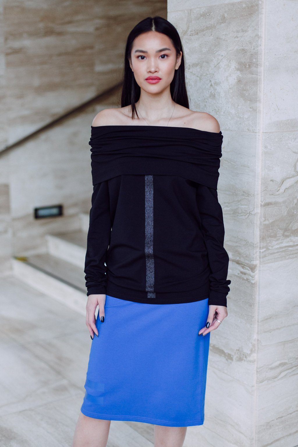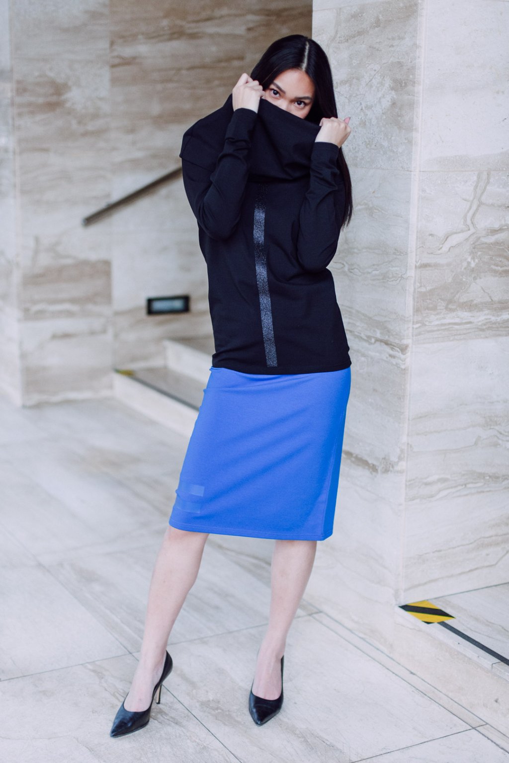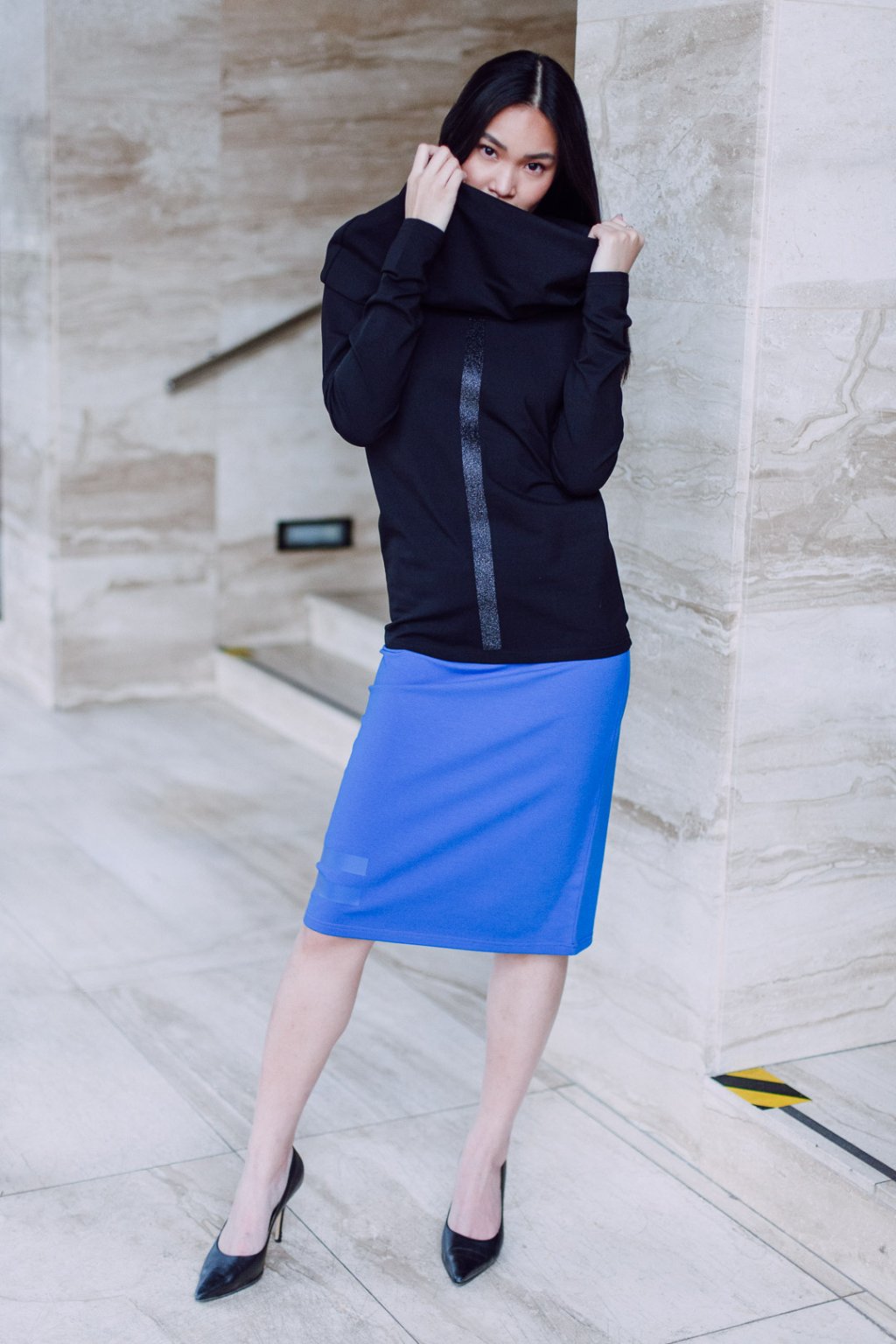 Triko s MAXI límcem, dlouhatánským raglánovým rukávem a glitter potiskem. Límec je dvojitý a směrem nahoru rozšířený, lze nosit na hlavě i vyhrnutý na ramenou nebo jen ledabyle.