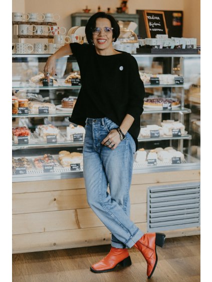 Triko je úzké, v bocích víc zúžené, dlouhatánský rukáv, pro podtržení minimalismu jsou okraje rukávů i spodek nezačištěný. Lodičkový výstřih.