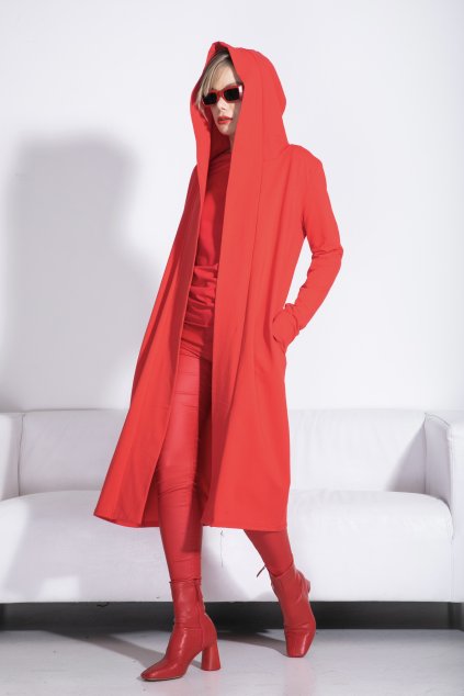 Šaty jsou mírně projmuté. Od boků dolů se rozšiřují do mírné A siluety. Kapuce s lemem (5cm). Dlouhatánský od lokte zužující se raglánový rukáv. Boční kapsy.