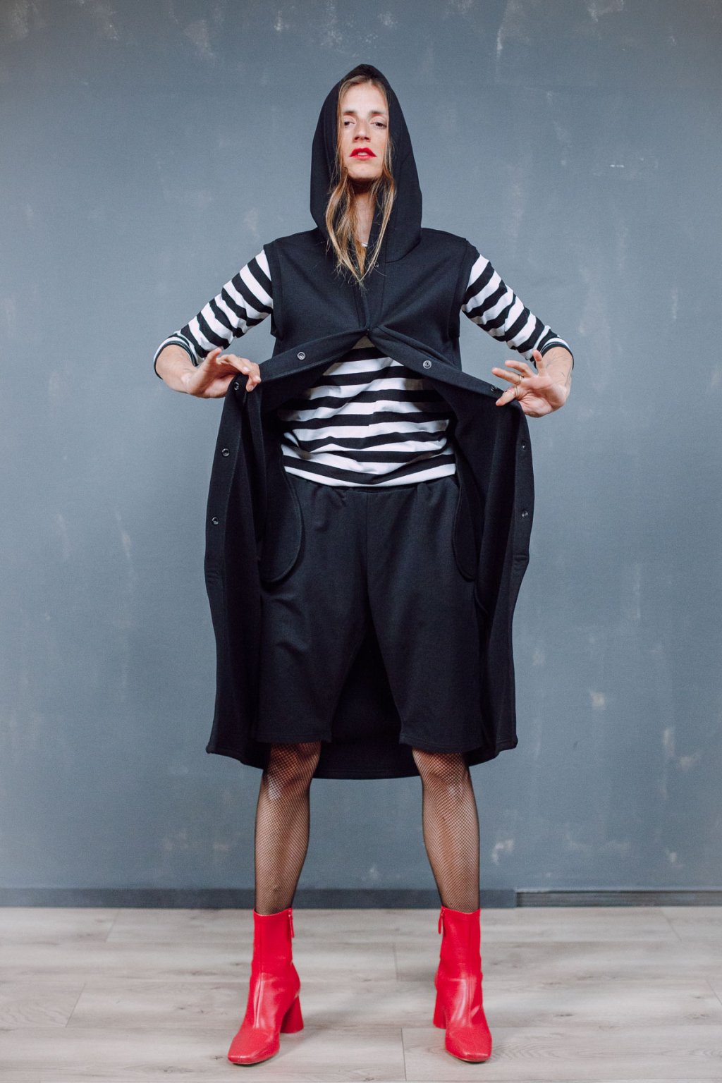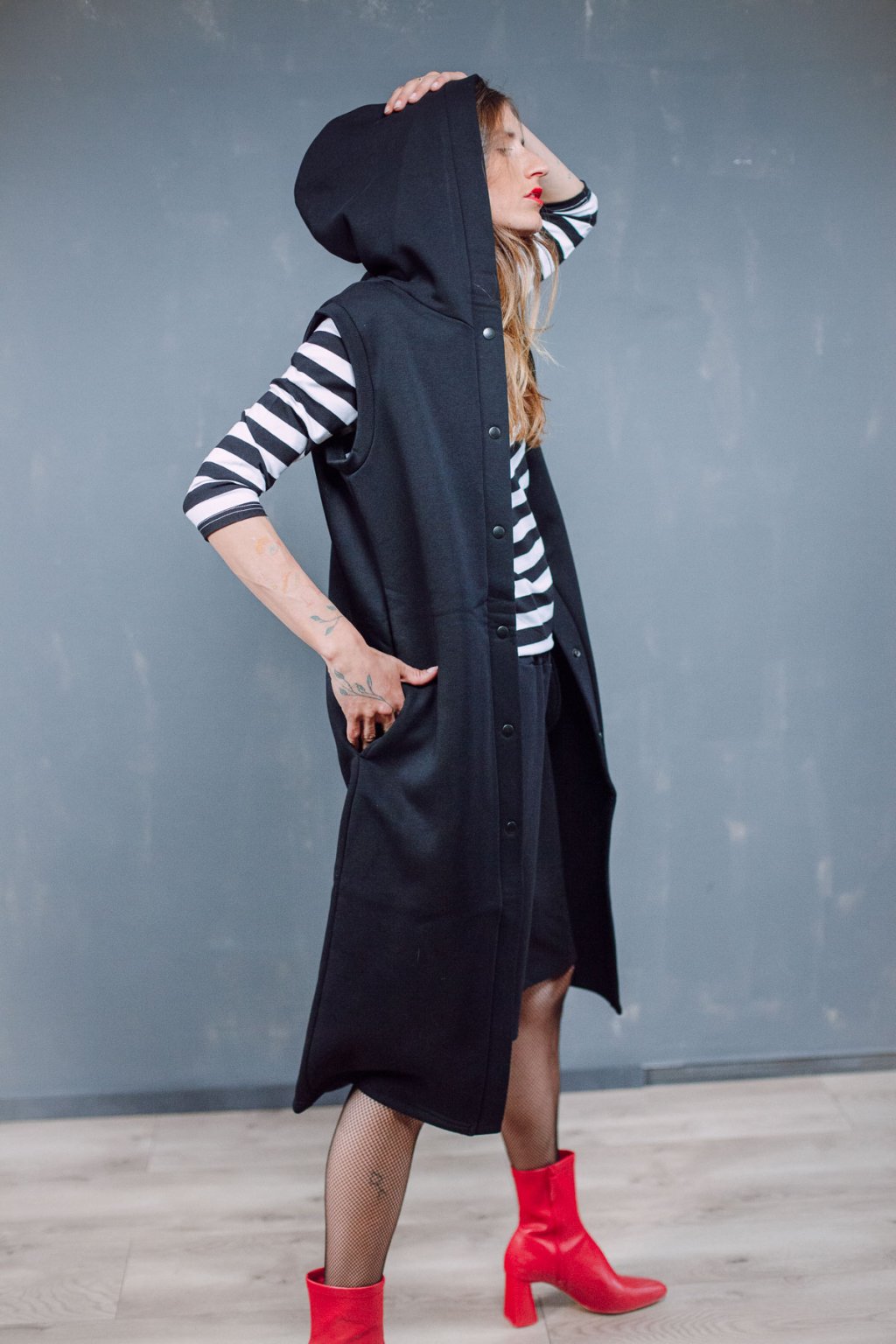 Černá vesta rovného střihu. Boční kapsy z ní dělají velmi praktický kousek, skvěle kombinovatelný s tričkem, kraťasy, tepláky a kalhoty z naší nabídky a vhodný pro oblíbené vrstvení.