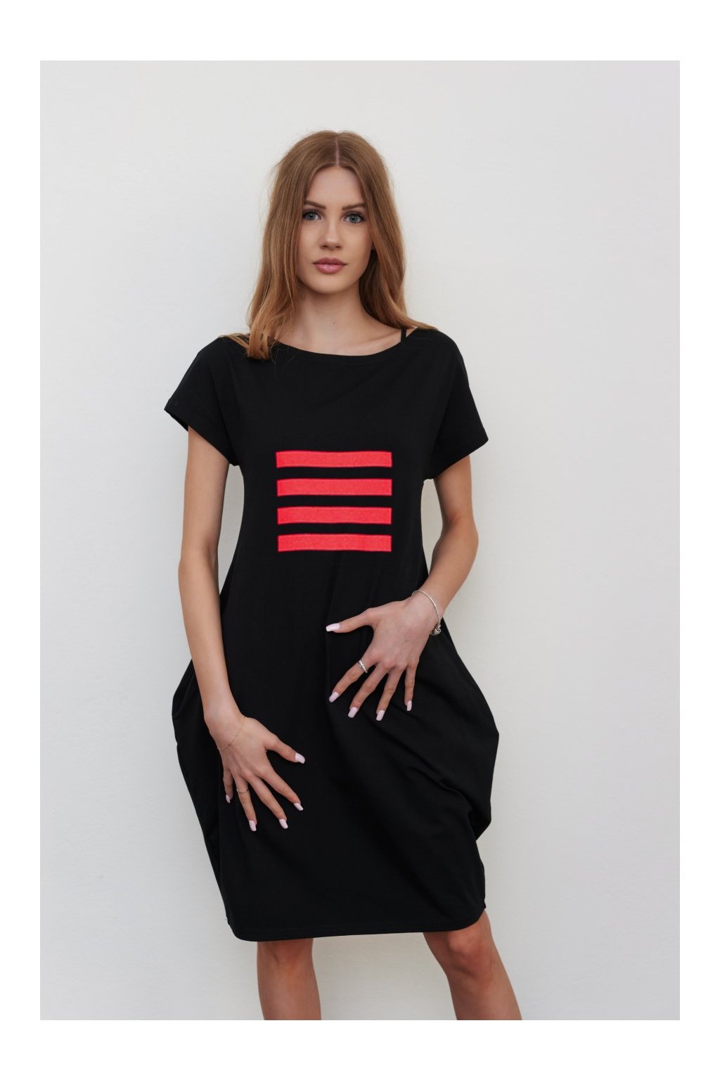 Šaty se směrem dolů rozšiřují, pak zaoblují a mírně zužují. Lodičkový výstřih. Krátký kimono rukáv. Boční kapsy.