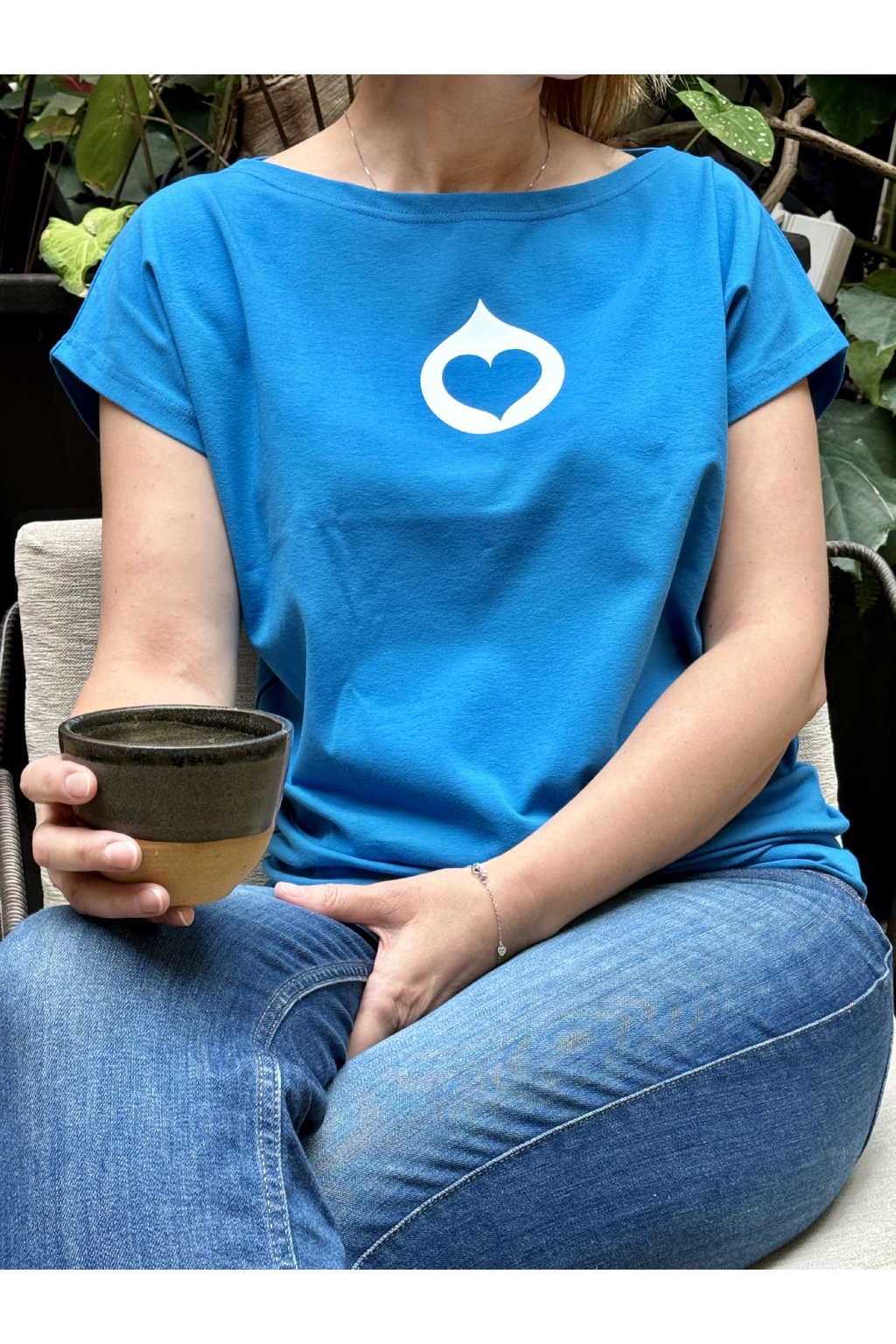 Tričko je netopýřího střihu, v ramenou široké, v bocích zúžené, s kimono krátkým rukávem se začištěnými okraji. Spodní lem trička je nezačištěný. Lodičkový výstřih.