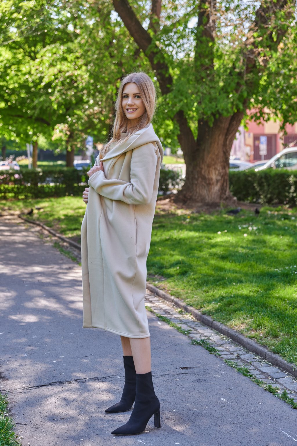 Přední díl je lemovaný širokým pruhem ze stejného materiálu, který ho propojuje s kapucí. Boční kapsy. Mikina je v délce midi.