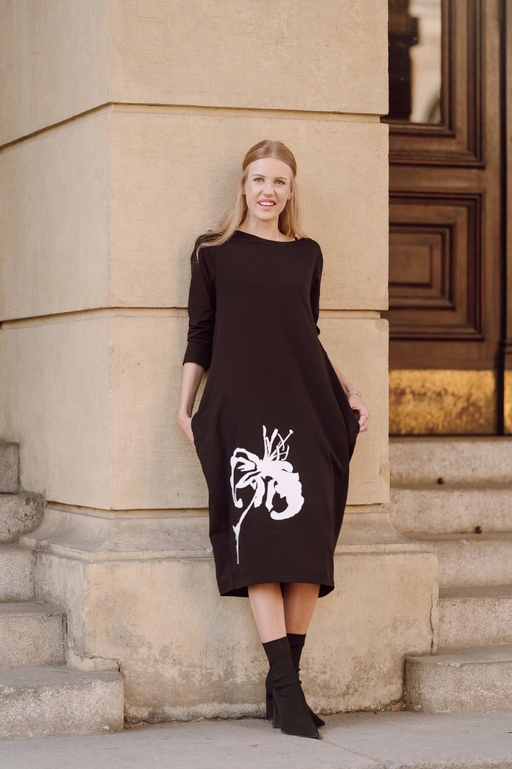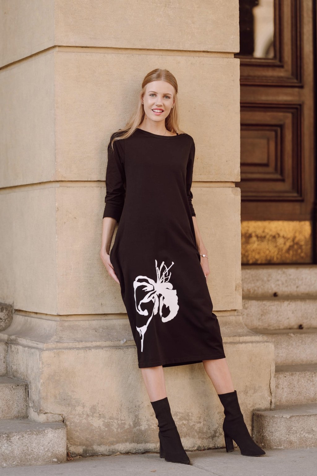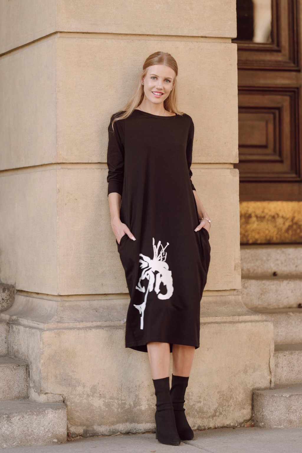 Šaty se směrem dolů rozšiřují, pak zaoblují a mírně zužují. Lodičkový výstřih, 3/4 rukávy a boční kapsy.