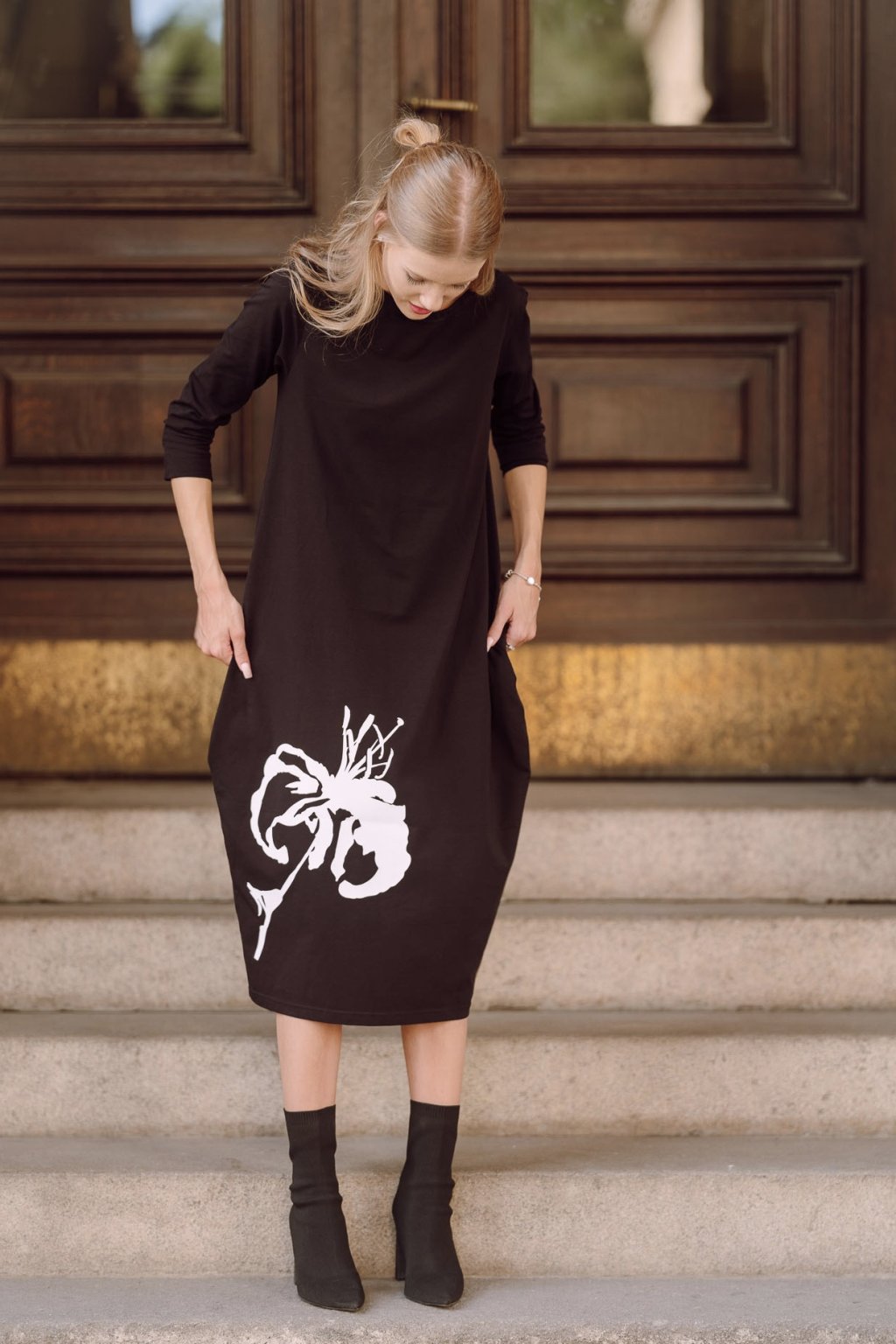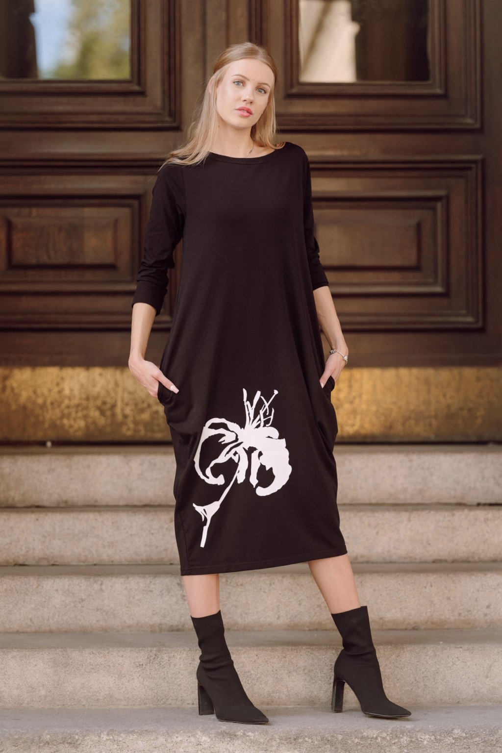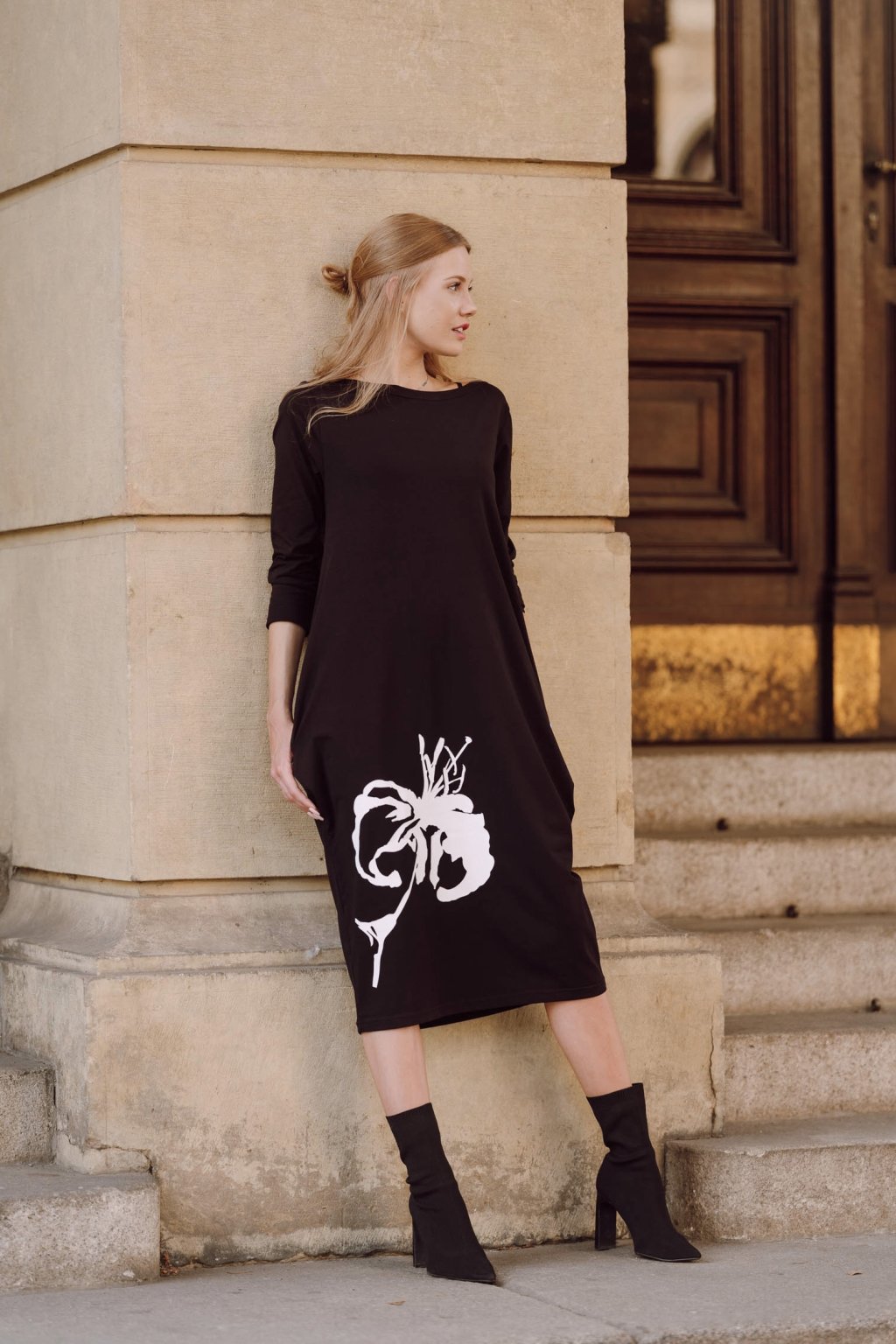 Šaty se směrem dolů rozšiřují, pak zaoblují a mírně zužují. Lodičkový výstřih, 3/4 rukávy a boční kapsy.
