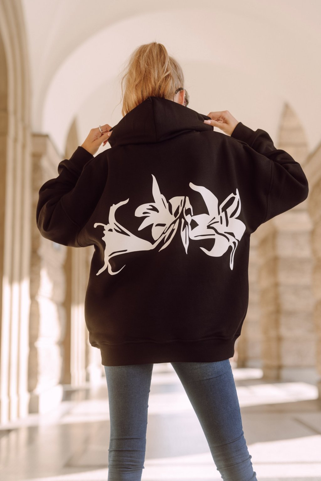 Černá mikina s kapucí a potiskem bílých lilií