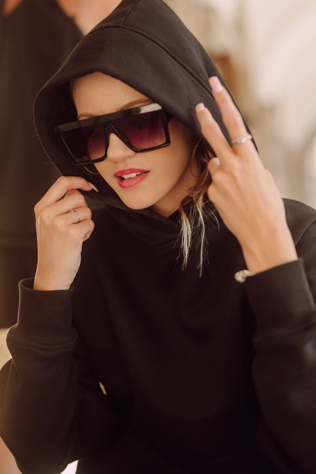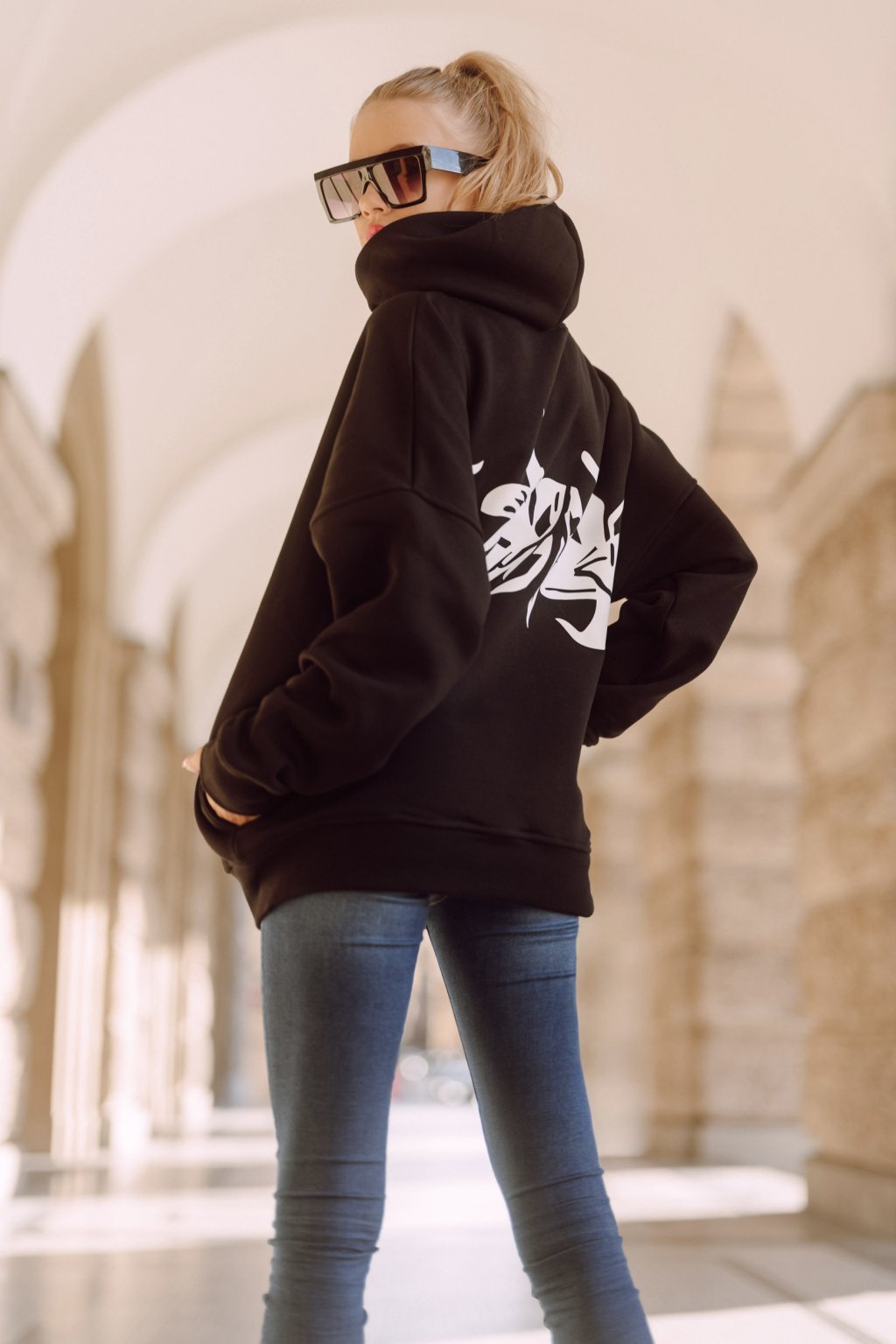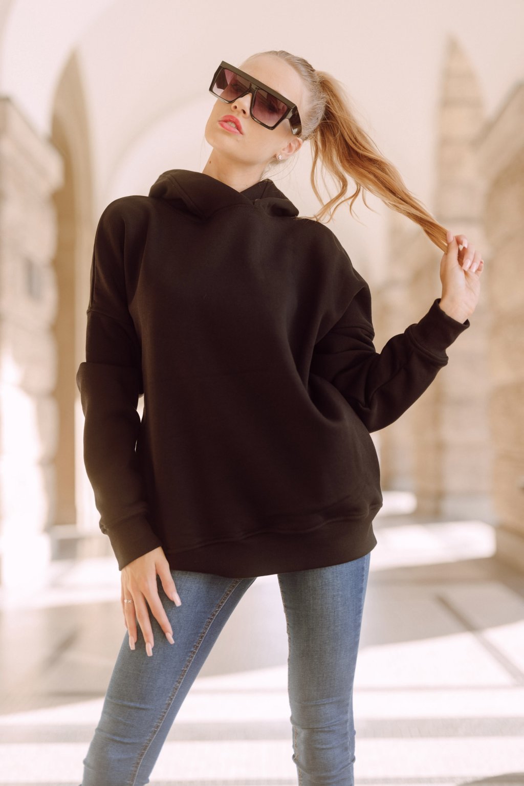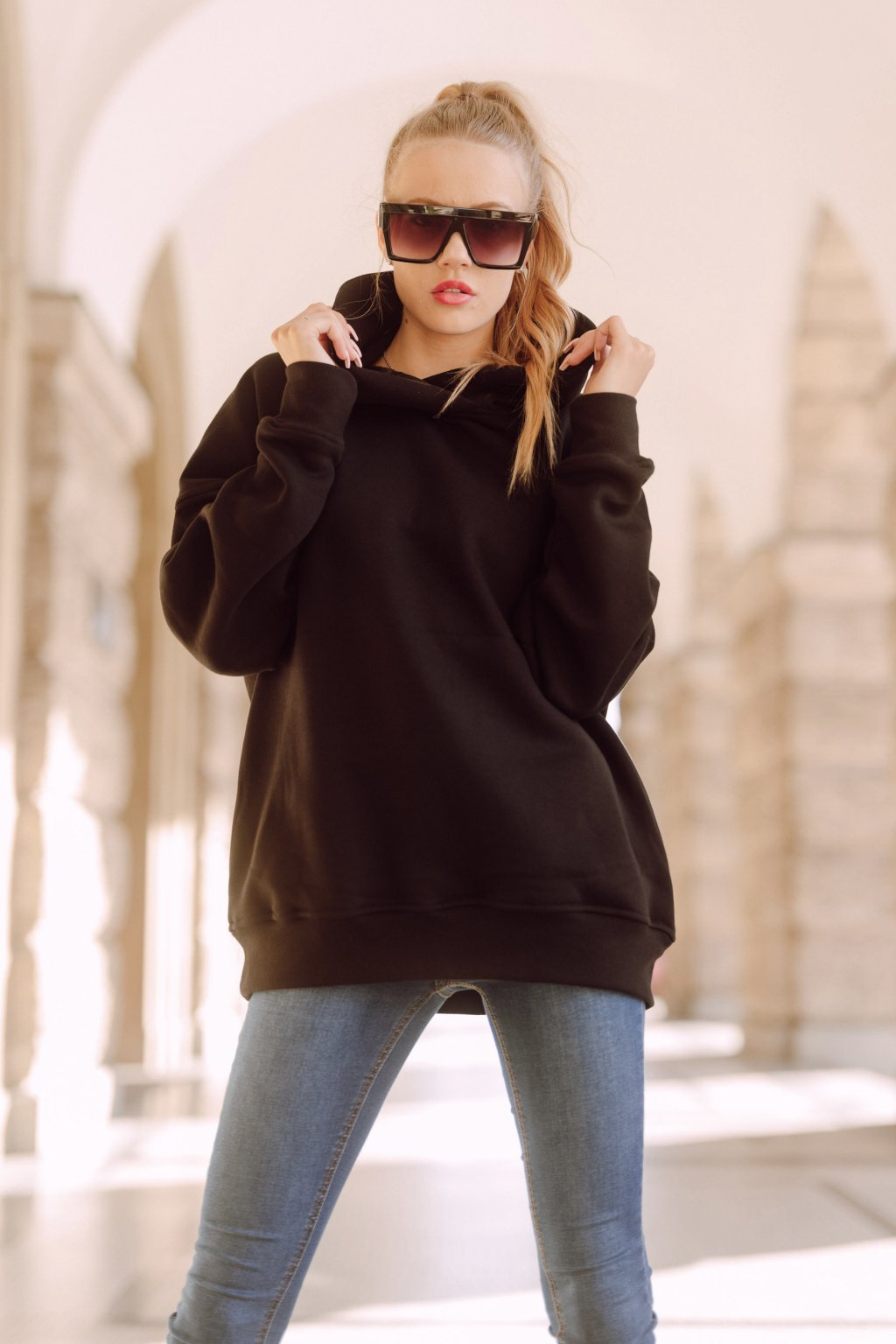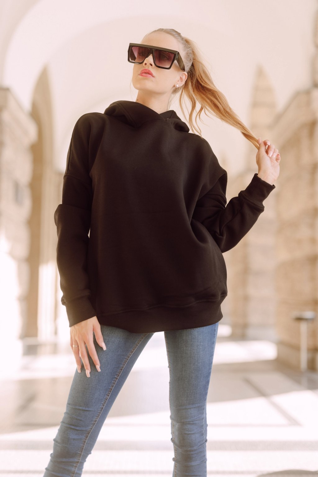 Mikina je hřejivá a velmi příjemná na nošení. Šijeme ji z počesané teplákoviny vyšší gramáže. Basic střih je mírně upraven do oversized, v ramenou je mikina široká a rukávy jsou směrem k zápěstí trochu zúžené. Švy jsou precizně prošité i zevně. Naddimenzovaná kapuce s širokým lemem a kapsy.