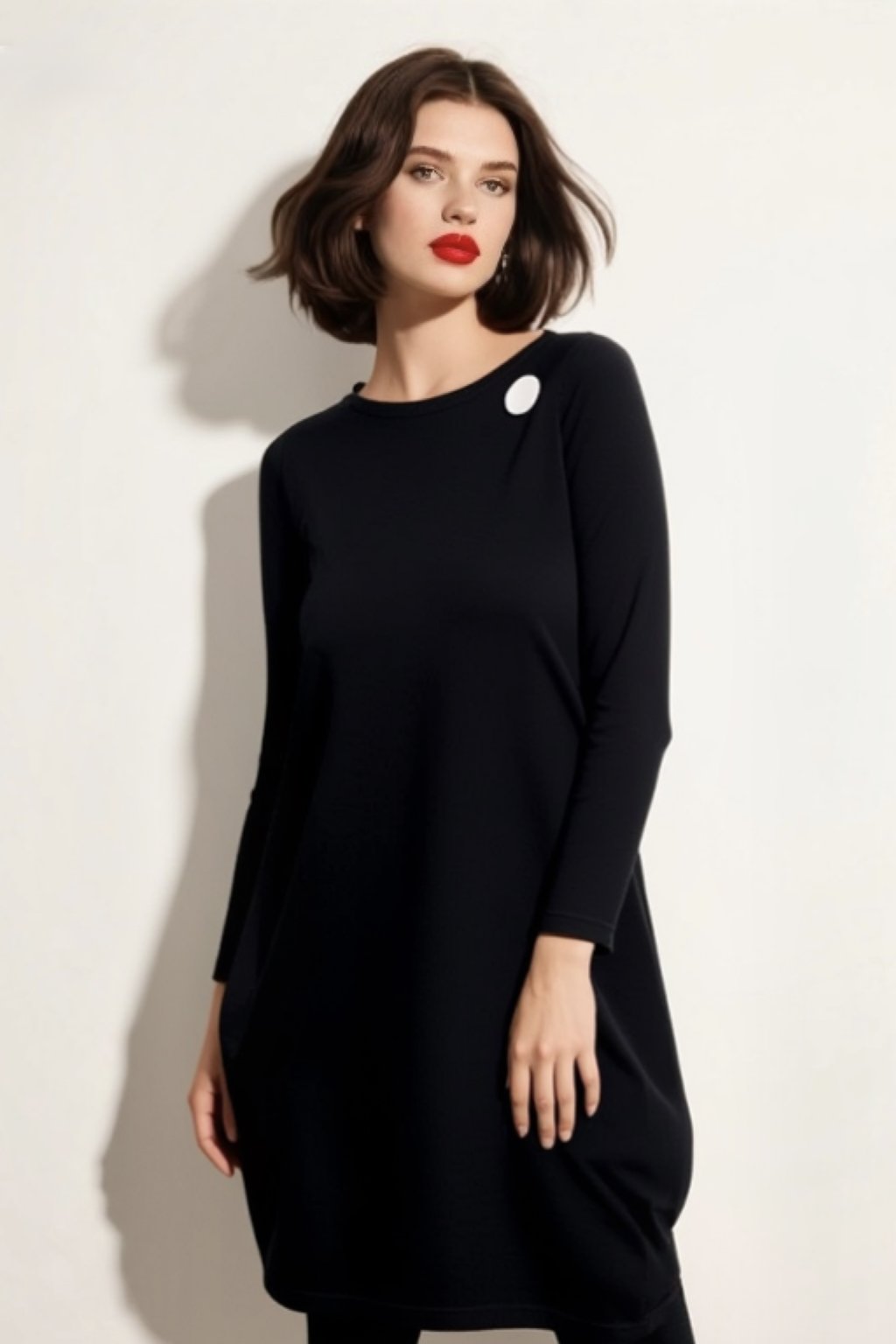 Šaty se směrem dolů rozšiřují, pak zaoblují a zužují. Mají boční kapsy, 3/4 všívaný rukáv a lodičkový výstřih.